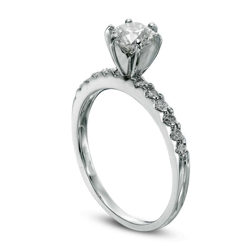 This engagement ring exudes effortless elegance and refinement. Its classic design is expertly crafted in 14K white gold and showcases a stunning 5/8 ct. diamond center stone secured by six prongs. Delicate round diamonds adorn the ring's slender shank, providing a touch of sparkle and finishing off the design beautifully. Expertly set with 7/8 ct. t.w. of diamonds and polished to a luminous shine, this ring is a treasure that your special someone will cherish forever.
