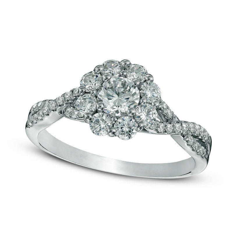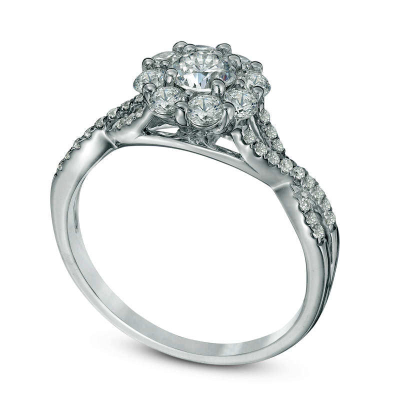 0.88 CT. T.W. Natural Diamond Flower Frame Twist Engagement Ring in Solid 14K White Gold