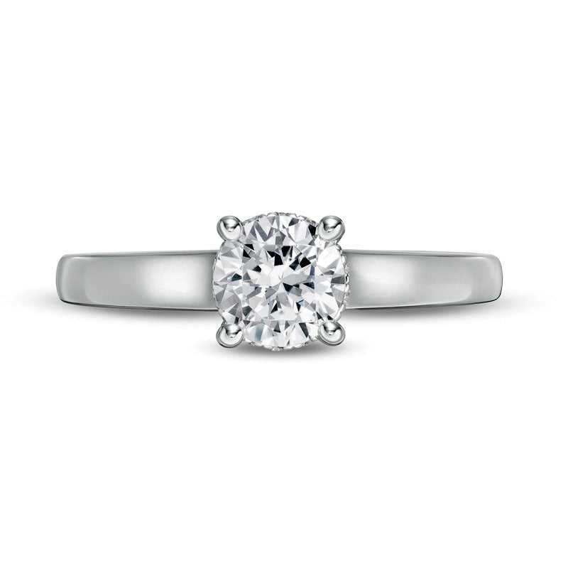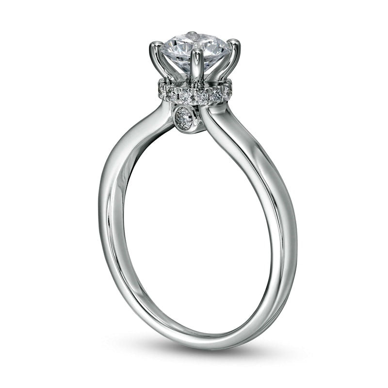 This sparkling diamond engagement ring is a true expression of your love. Expertly crafted from luxurious 14K white gold, the timeless design features a stunning 3/4 ct. diamond solitaire at its center. A hidden burst of sparkle, a delicate ribbon of diamonds elegantly wraps around the setting, while the gallery gleams with bezel-set diamonds. Boasting a total weight of 7/8 ct. t.w. of diamonds and a brilliant polished shine, this exquisite engagement ring perfectly complements your partner's individual style - for now and forever.