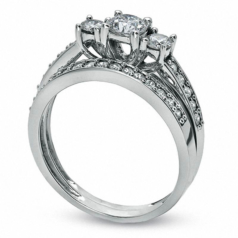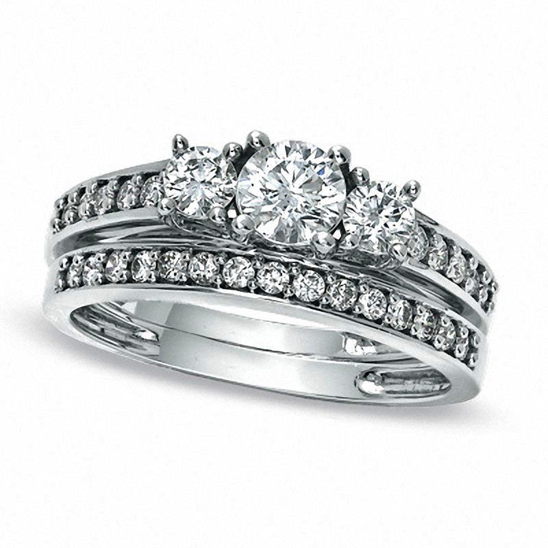 Make the moment magical when you ask for her hand with this breathtaking diamond bridal set. Crafted in 10K white gold, the engagement ring boasts a trio of round diamonds - the largest being an impressive 3/8 carat - that are perfectly aligned atop the diamond-studded shank. The coordinating wedding band features equally stunning diamonds, completing this majestic ensemble. With a regal and radiant design, this bridal set dazzles with an impressive 7/8 carat total weight of diamonds and a bright polished finish. It's the perfect symbol of your love and commitment to one another.