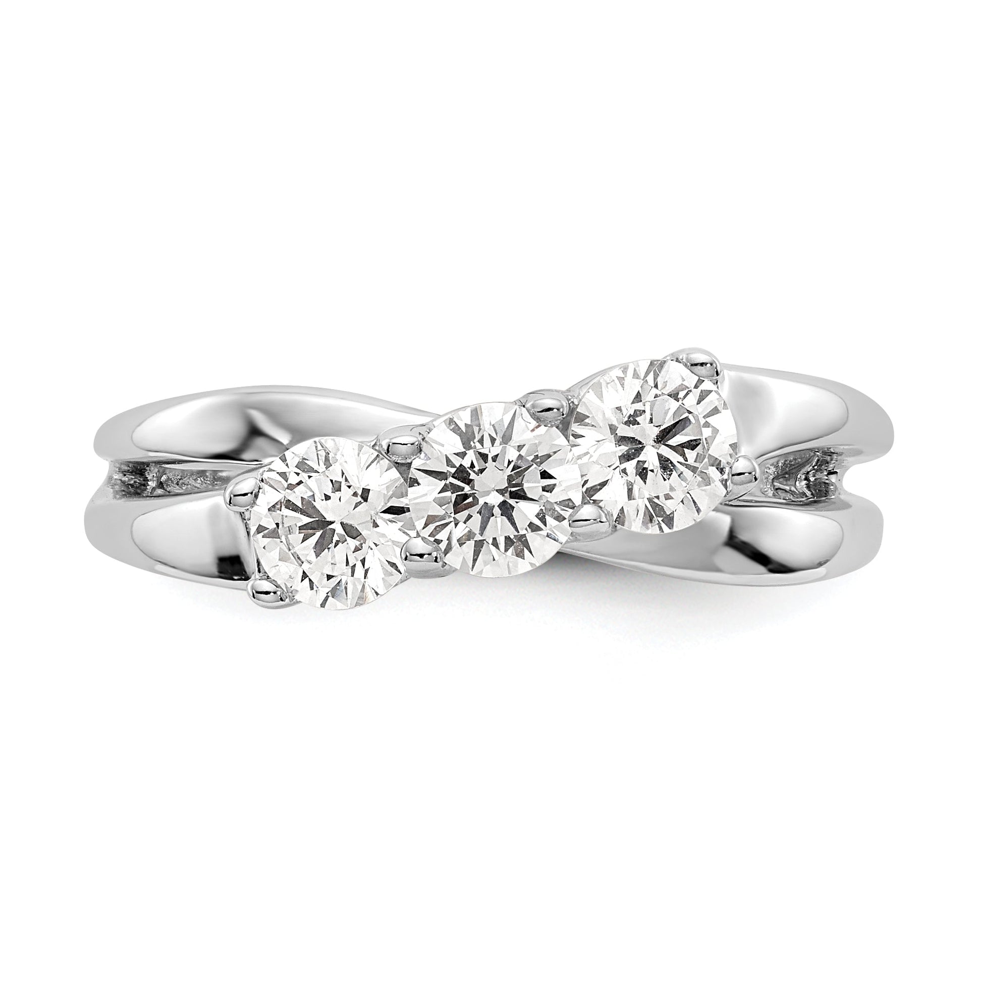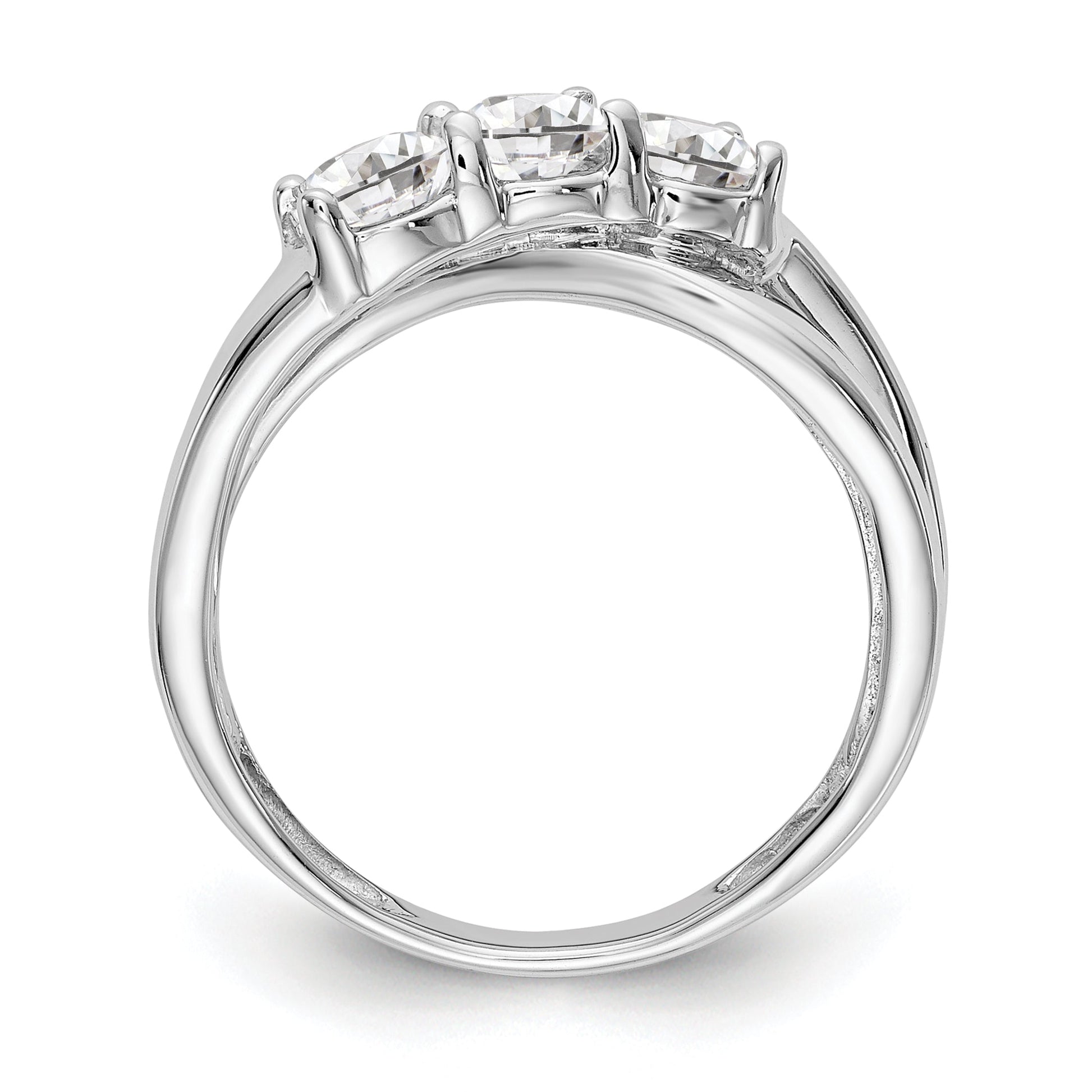 The band width of the ring ranges from 1.97 to 5.68 mm and has an open-back feature. It weighs 0.295 ct and features 3 round-cut cubic zirconia stones. The ring top length is 4.25 mm, and the ring top width is 12.85 mm. This ring is designed to fit any finger size and can be resized if needed. Its timeless design, paired with high-quality materials, make it a must-have for any jewelry collection.