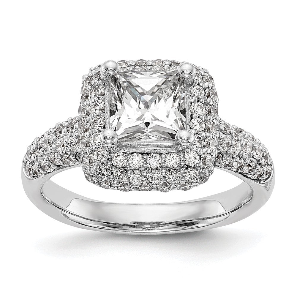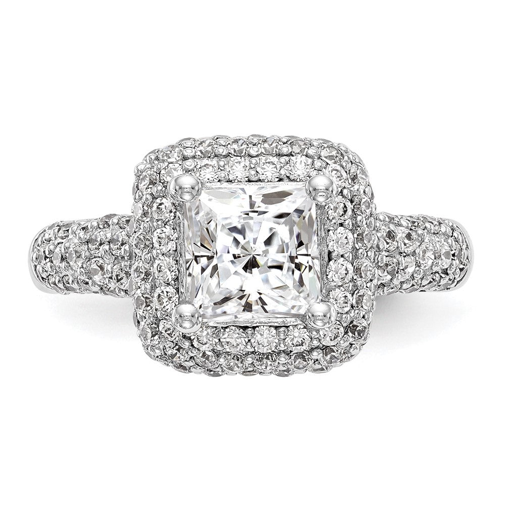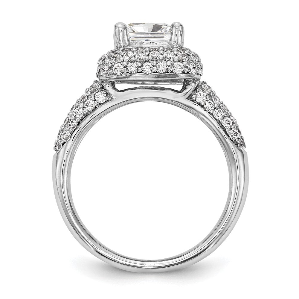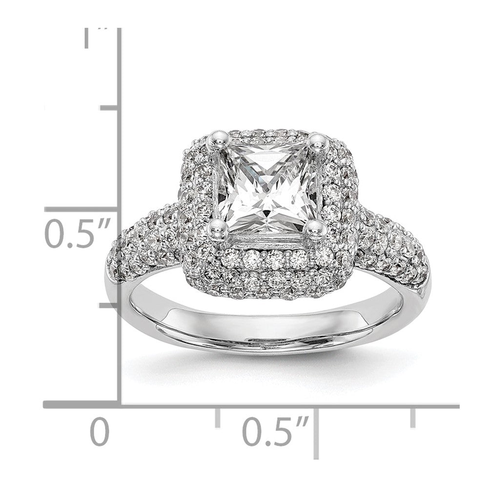This is a beautiful engagement ring made of 14K white gold with a cubic zirconia center stone and 106 smaller stones. The ring is crafted by experienced jewelers and stamped with 14K for authenticity. It will not rust or discolor. The ring can also be made with natural diamonds. It's perfect for special occasions or daily wear and makes a great gift. Your purchase comes with a 30-day money-back guarantee and a gift box. The ring is available in sizes 6 to 8 with adjustments in increments of 0.25.