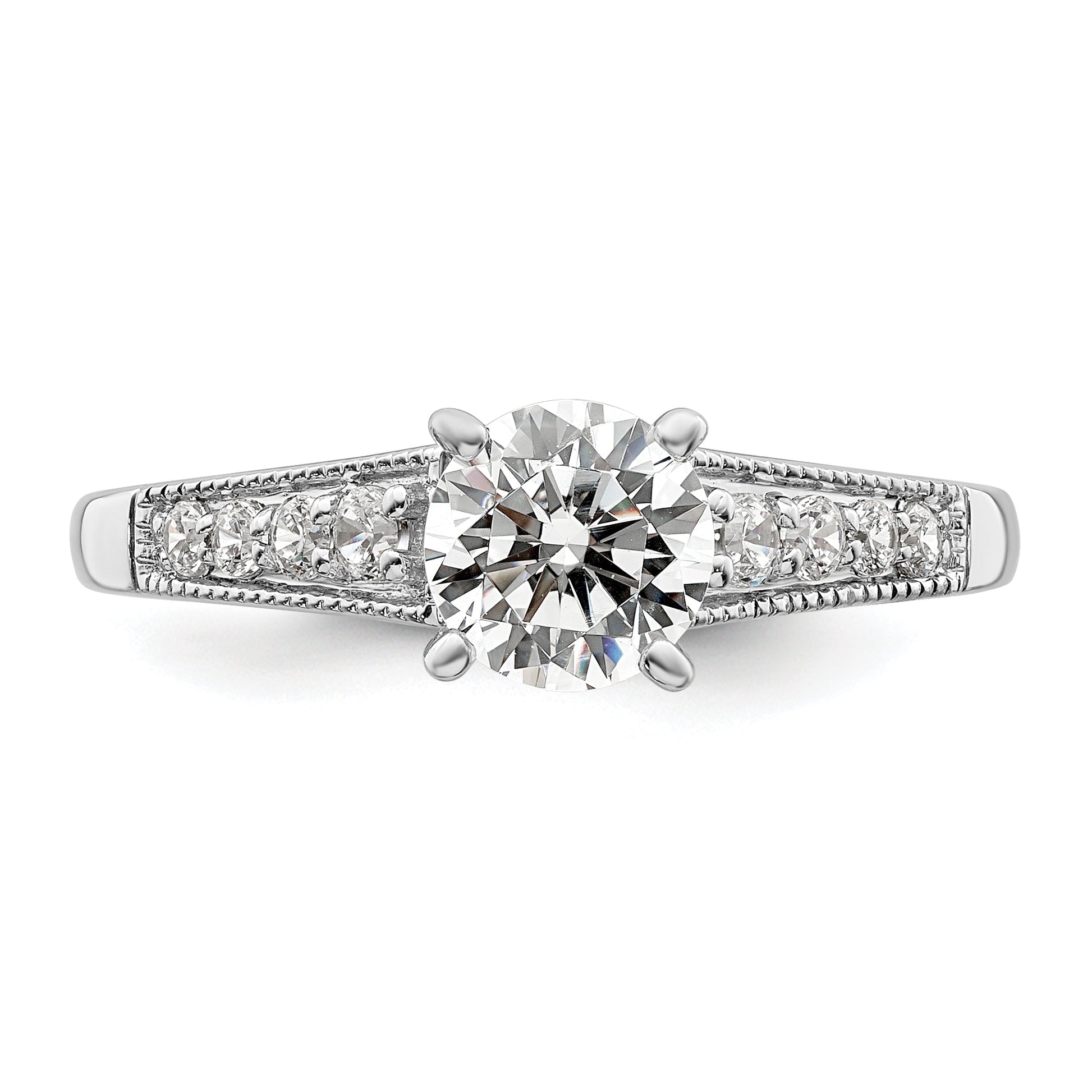 This semi-mount ring has a width of 1.9 to 3.8mm, and the band is tapered for an elegant look. The head height is 7mm, and the ring is suitable for resizing. Stone settings 2-4 are prong set, and stone clarity is I1 (AA) for stones 2-5. The ring is finished with rhodium plating and has an open back profile type. It's a beautiful piece of jewelry that exudes grace, elegance, and sophistication. Order yours today!