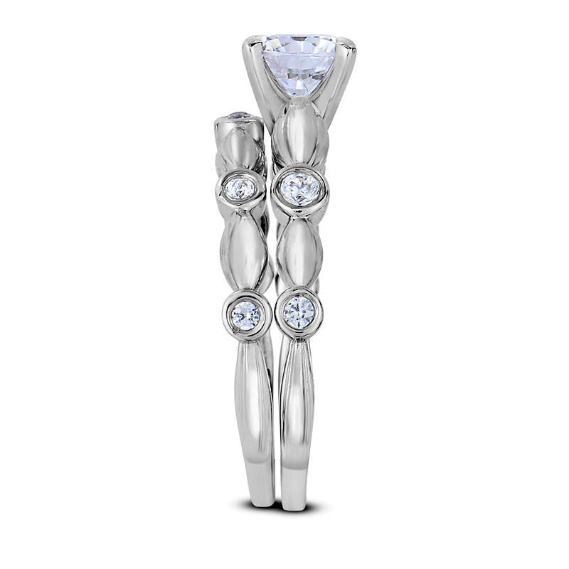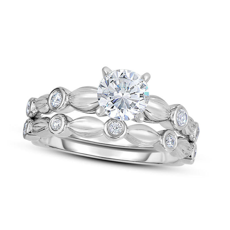 This beautiful diamond bridal set is made of 14K white gold and includes an engagement ring and coordinating wedding band. The engagement ring has a 1 carat center diamond and features a unique pattern of textured scallops and bezel-set diamonds on the band. The wedding band is also lined with diamonds. The set has a total of 1.1 carats of diamonds and shines brightly. It's perfect for expressing your love on your special day.