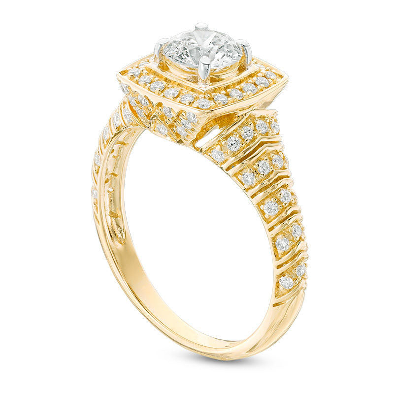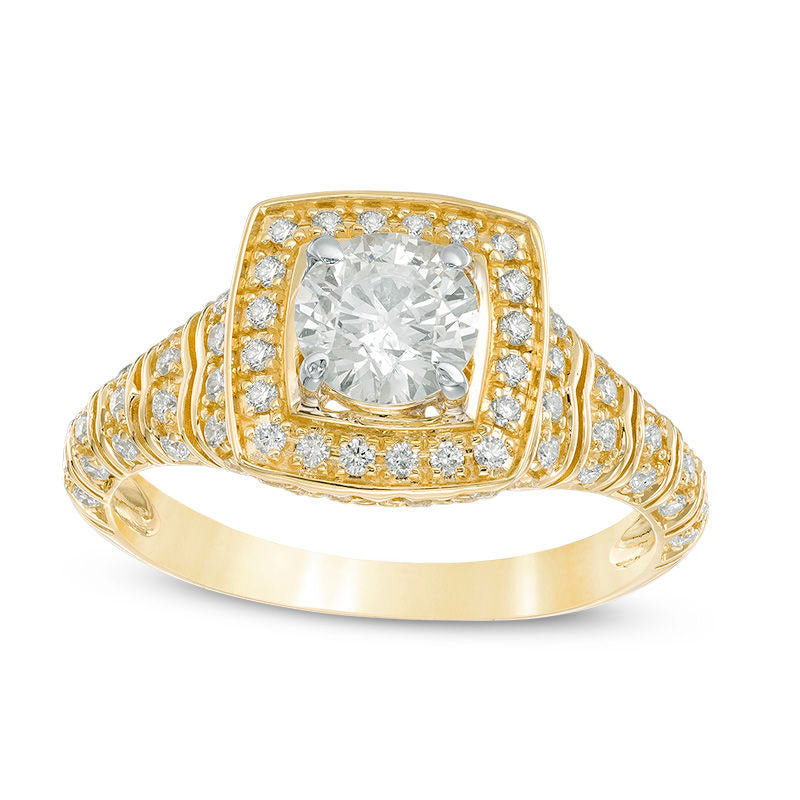 This stunning diamond engagement ring is a true symbol of your love and devotion. Crafted from luxurious 14K gold, its unique and eye-catching design features a dazzling 3/4 ct. diamond at the center, encircled by a cushioned-shaped frame adorned with sparkling diamonds. The deep setting also showcases additional diamonds on the sides. The wide shank is elegantly decorated with rows of shimmering diamonds, completing the sophisticated look. With a total diamond weight of 1-1/10 cts. t.w., this engagement ring is polished to a brilliant luster that will shine for a lifetime. Give your beloved the ultimate expression of your love with this breathtaking diamond ring.