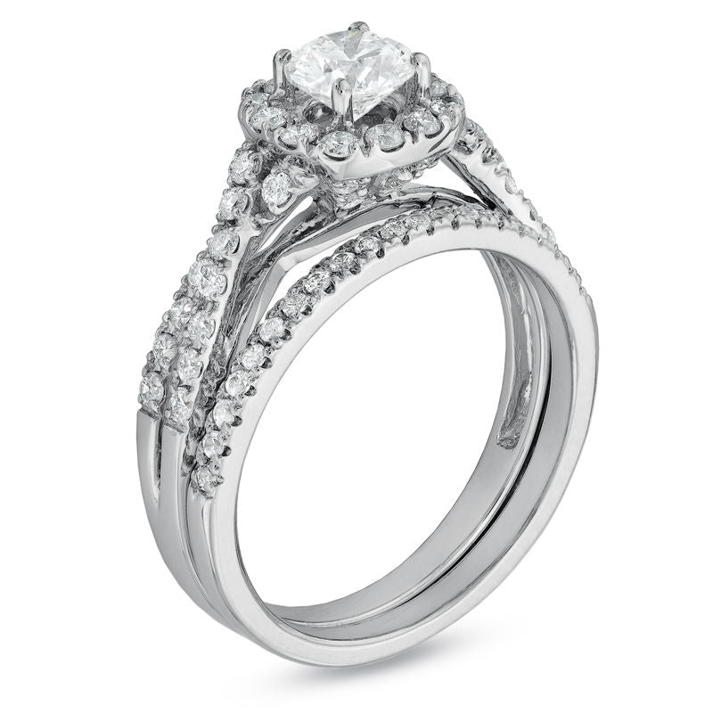 Manufactured in 14K white gold, this bridal engagement ring set features a glittering 1/2 ct. round diamond center stone surrounded by a squared frame bordered with smaller accent diamonds. The twirling and twisting shank is set with additional round accent diamonds for extra sparkle. All diamonds on this bridal set are natural and earth mined.