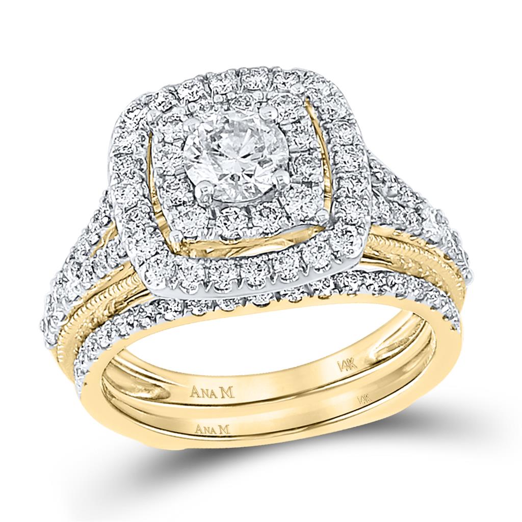 This certified bridal set boasts a stunning 1 and 1/2 carat diamond total gemstone weight set in 14 karat yellow gold with a weight of approximately 7.2812 grams. The round, G-H colored, and SI3 clarity diamond is prong-set as the primary gemstone with a carat weight of 0.5. The second diamond garners a weight of 1.01 carats, in a round shape with G-H color and I1-I2 clarity, and is also prong-set. There is no third gemstone.
