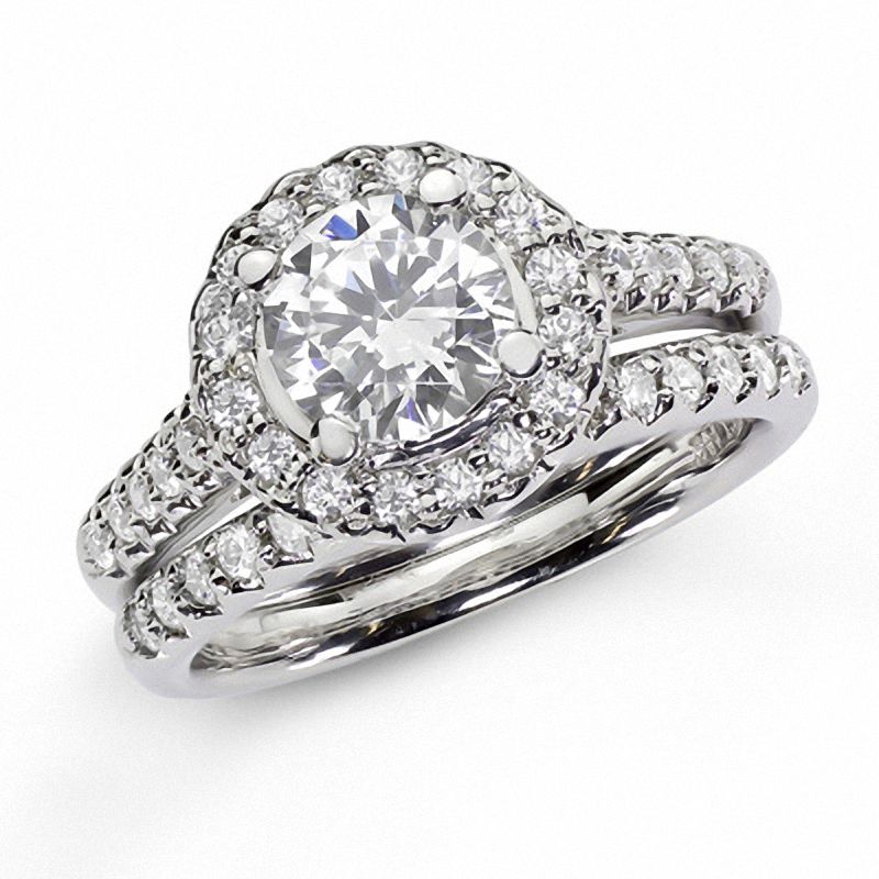 Manufactured in 14K white gold, this bridal engagement ring set features a diamond-studded shank and frame surrounding a 5/8 ct. round diamond that radiates remarkable shine at the center. All diamonds on this set are natural and earth mined.