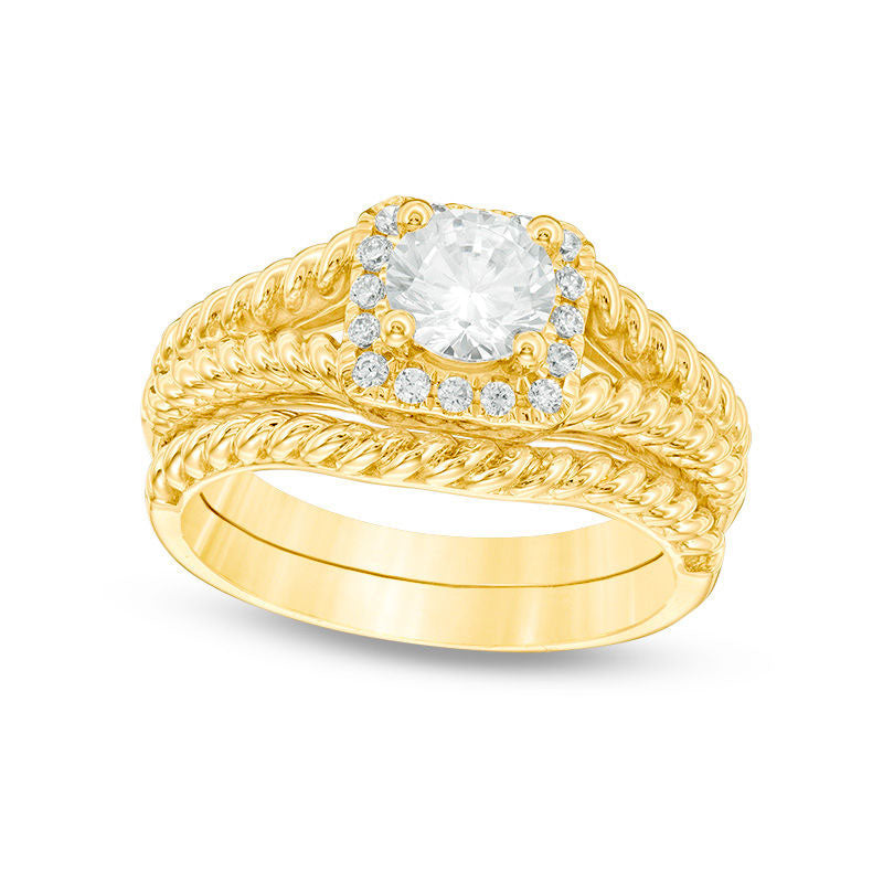 Looking for a beautiful and tasteful bridal set that will make her heart skip a beat? Look no further than this stunning diamond ring and wedding band duo. Made from 14K gold, the engagement ring features an impressive 1 ct. diamond wrapped in a square frame of sparkling diamonds, while the twist split shank adds texture and interest to the design. And with a coordinating contoured twist wedding band, this bridal set is the perfect way to express your love on your special day. With 1-1/6 cts. t.w. of diamonds and a brilliant buffed luster, this set is a glittering token of your love that she'll treasure forever.
