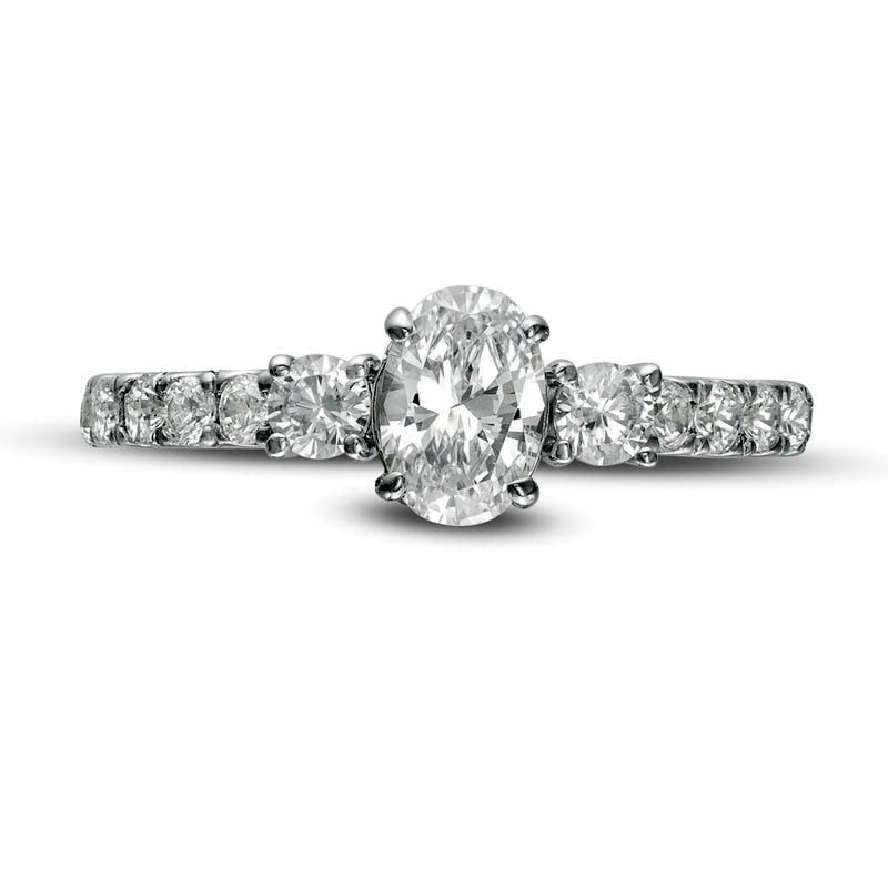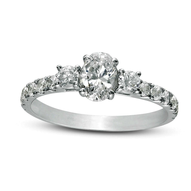 Celebrate the next chapter of your love story with this captivating diamond engagement ring. Crafted in 14K white gold, this ring features a stunning 5/8 ct. diamond at its center, elegantly flanked by two 1/10 ct. diamonds. The shank is beautifully adorned with additional diamonds, totaling 1-1/6 cts. t.w., adding to the overall brilliance of the ring. With a bright and polished shine, this three-stone engagement ring is the perfect symbol of your love and commitment.
