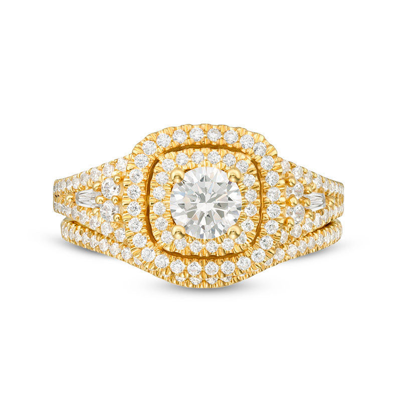 This breathtaking diamond bridal set is the ultimate expression of your love. Crafted from luxurious 14K gold, the engagement ring is stunning, featuring a captivating 1/2 ct. diamond that is surrounded by two cushion-shaped frames of glittering diamonds. The shank is adorned with a pair of 1/20 ct. baguette-cut diamonds set between shimmering, diamond-studded ribbons. The coordinating contoured wedding band finishes the look with a row of delicate diamonds. This spectacular set boasts a total of 1-1/5 cts. t.w. of diamonds and is polished to a brilliant shine, making it a truly exceptional symbol of your devotion.