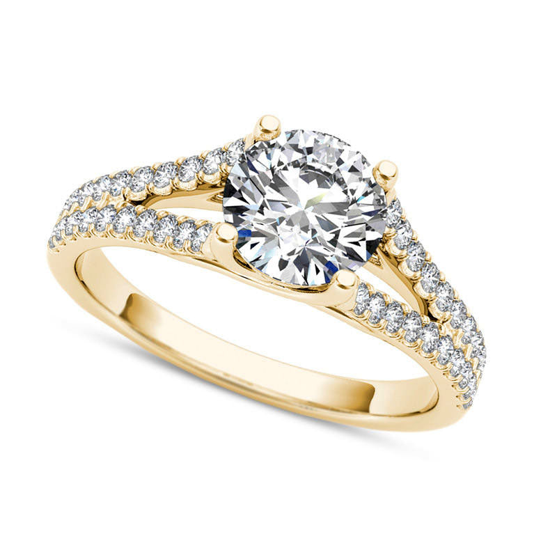 Imagine pledging your love to your partner with a stunning diamond engagement ring. Our breathtaking 1-1/5 CT. T.W. Diamond Double Row Split Shank Engagement Ring in 14K Gold is the perfect fit. This exquisite ring is crafted in warm 14K gold and boasts a brilliant 1 ct. diamond atop a split shank adorned with a row of shimmering pavé-set diamonds. With its dazzling 1-1/5 cts. t.w. of diamonds and a bright polished shine, this engagement ring is a true celebration of your romance. Show your love with a gift that they will cherish forever.