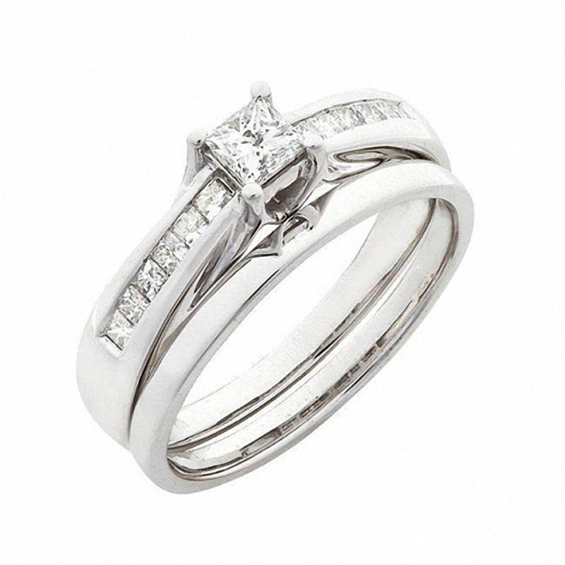 Manufactured in 14K white gold, this bridal engagement ring showcases a brilliant 1/4 ct. princess-cut diamond center stone in a traditional four-prong setting. Additional princess-cut diamonds line the ring's shank. All diamonds on this bridal set are earth mined and natural.