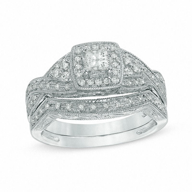 Manufactured in 14K white gold, this popular bridal engagement ring set showcases a 0.20 ct. princess-cut center stone sparkling brightly. The side diamonds are micro-set, bringing the total to a breathtaking 1/2 ct.. All diamonds on this set are natural and earth mined.