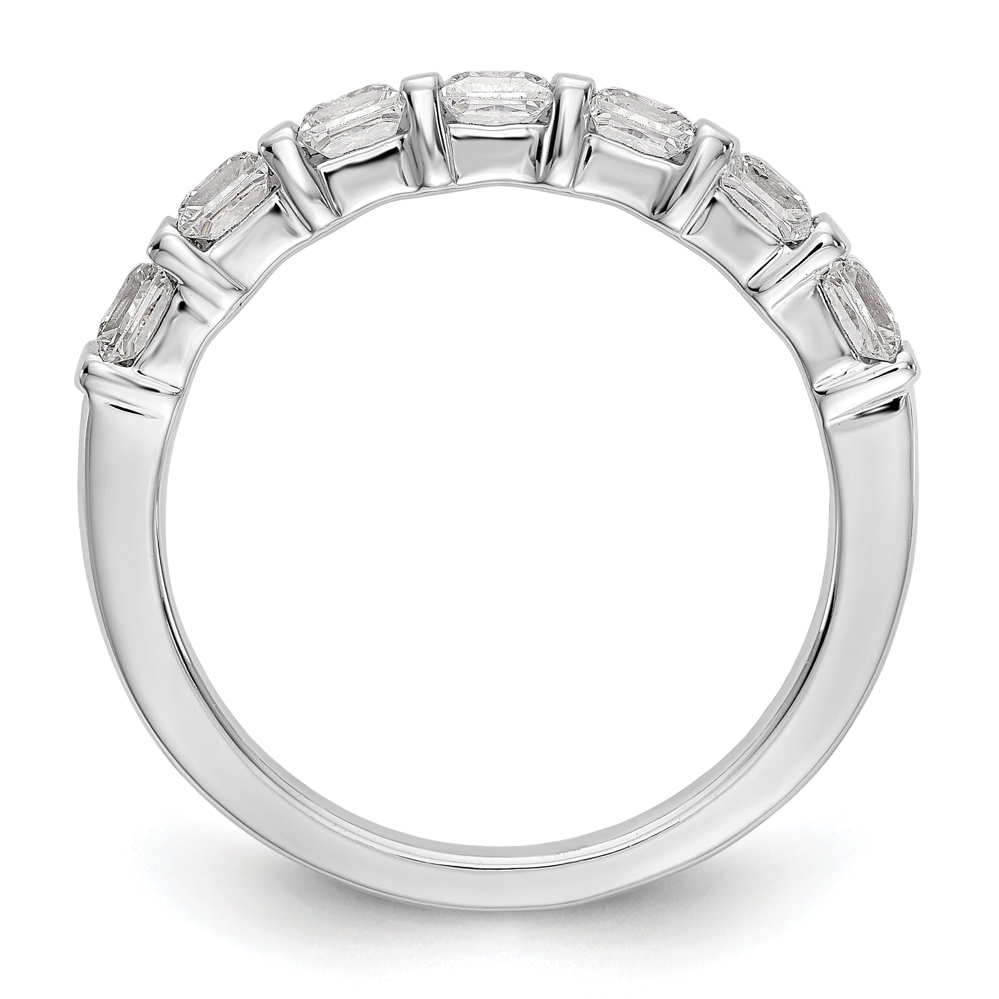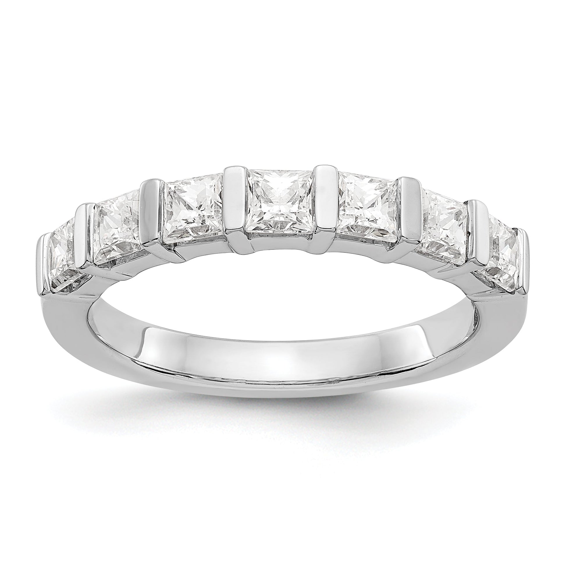 This is a beautiful wedding band ring that comes in 14K solid white gold with 7 high-quality cubic zirconia stones. The ring is stamped with 14K to guarantee its authenticity and superior quality. The CZ's are hand-set and polished by experienced jewelers. If requested, it can be upgraded to natural diamonds for an additional cost. The ring is designed as the perfect gift for special occasions or to show love to someone special. It comes with a 30-day money-back guarantee and a complimentary giftbox. The band is 2.9 to 2.8 mm wide and can be adjusted to fit between sizes 6 and 8.