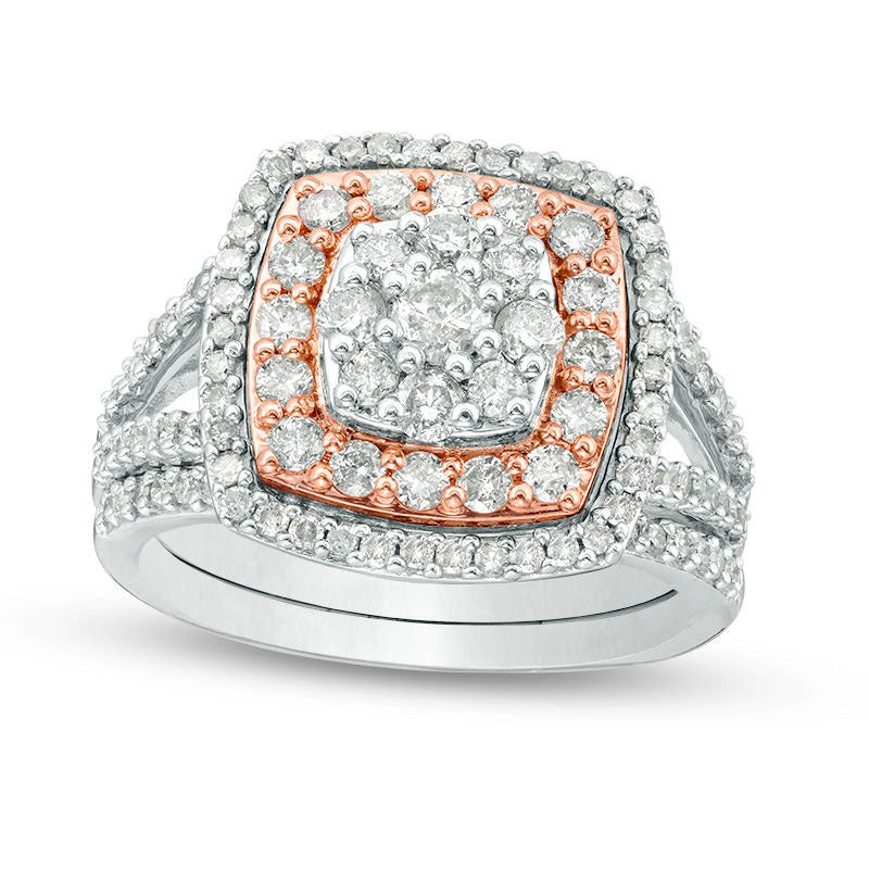 Get ready to cherish the special moments with this stunning diamond bridal set. Made from 10K two-tone gold, the engagement ring features a brilliant 1/10 ct. diamond at the center of a round diamond cluster in white gold. A cushion-shaped halo frame of diamonds in rose gold and white gold adds a touch of drama to this one-of-a-kind piece. The split shank of the ring is adorned with tiny diamonds, while the matching wedding band completes the set. With 1-1/4 cts. t.w. of diamonds and a radiant polish, this bridal set symbolizes the beauty of your love story.