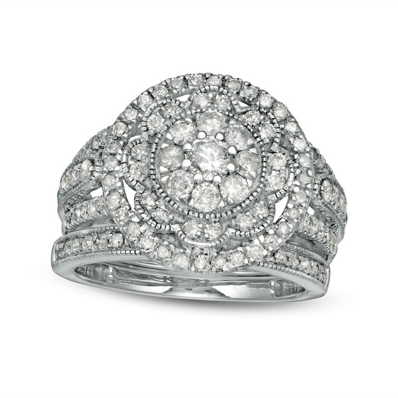 This is a beautiful engagement and wedding ring set made of 10K white gold. The engagement ring has a grouping of diamonds in the center, surrounded by smaller diamonds and intricate details. The band also has diamonds and matching details. The set contains 1-1/4 carats total weight of diamonds and has a shiny finish. It is a perfect choice for a romantic and vintage-inspired wedding.