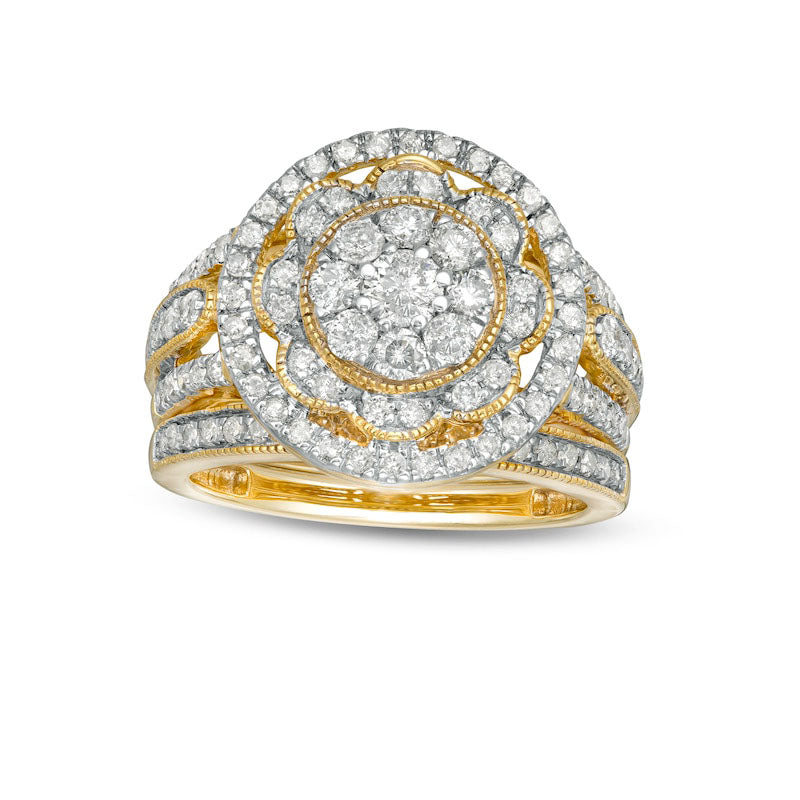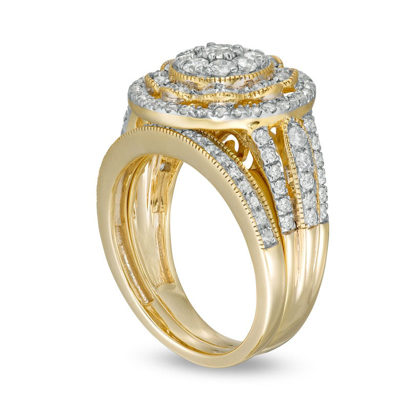 Delightfully romantic, this vintage-inspired diamond bridal set is a shining masterpiece that will capture hearts. Crafted in warm 10K gold, the captivating engagement ring features a composite of diamonds, adorned with a 1/8 ct. stone, enveloped by a delightful scalloped frame of diamonds and detailed milgrain. A diamond halo surrounds the centerpiece, adding a breath-taking finish. The split shank boasts impeccably intricate milgrain borders around the exquisite, rounded diamond-lined middle ribbon, while outer diamond-lined rows contribute extra glitter. Complete her elegant ensemble on your big day with the diamond and milgrain-adorned band. This bridal set boasts a remarkable 1-1/4 cts. t.w. of diamonds and a brilliant, buffed luster, reflecting the depth of your love.