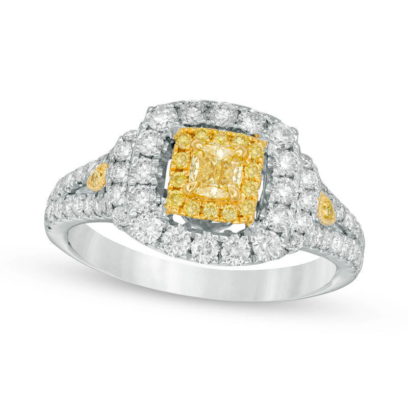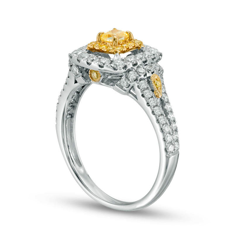 1.25 CT. T.W. Cushion-Cut Yellow and White Natural Diamond Double Frame Collar Engagement Ring in Solid 14K Two Tone Gold - Size 7