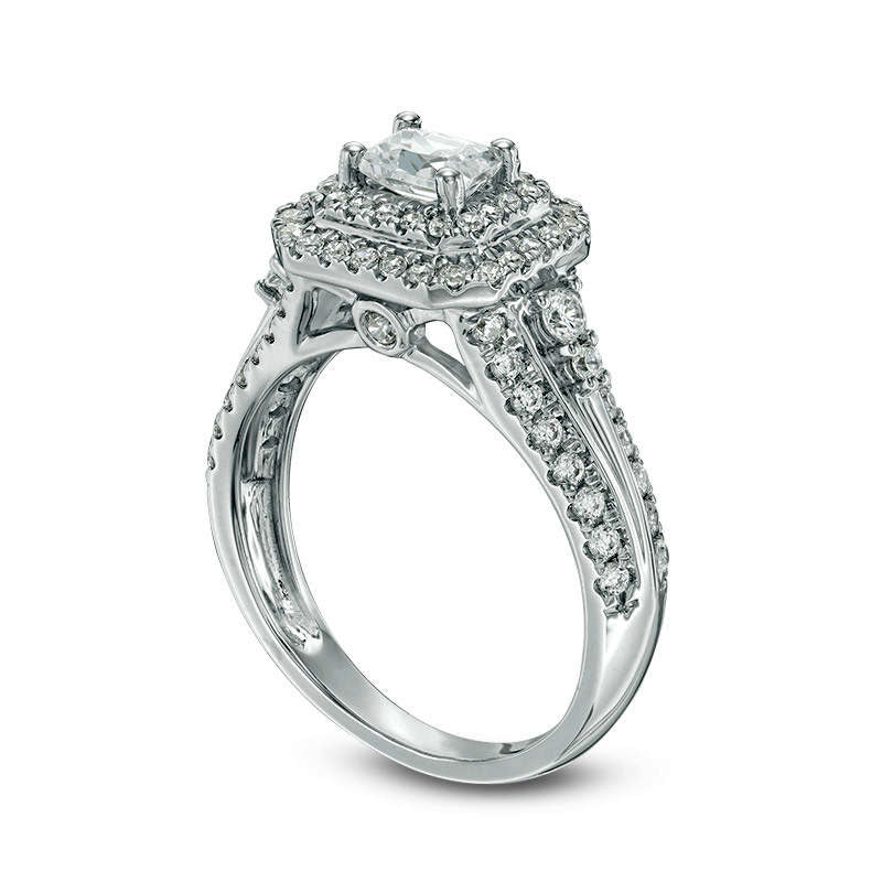 Looking to make a grand statement with your engagement ring? Look no further than this stunning diamond piece. Expertly crafted from 14K white gold, this magnificent ring features a gorgeous 1/2 ct. emerald-cut diamond at its center, enveloped by not one but two cushion-shaped frames of glittering round diamonds. The sides of the shank are adorned with more diamonds, adding to the overall sparkle and brilliance of this piece. With a total weight of 1-1/4 cts. t.w., this ring is sure to delight and impress your loved one. Shining brightly with its polished finish, this engagement ring will leave no doubt in anyone's mind as to your undeniable love.