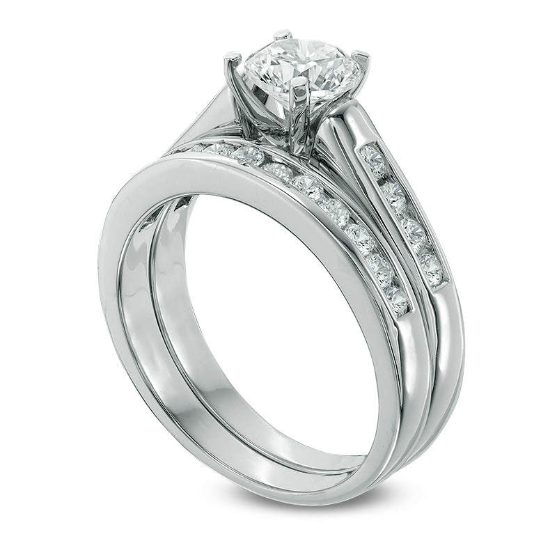 Celebrate your love with this exquisite diamond bridal set, featuring a stunning 3/4 ct. round diamond center stone set in a timeless cathedral setting. The engagement ring is expertly crafted in 10K white gold and adorned with smaller round accent diamonds, elegantly channel-set into the tapered shank. Completing the set is a coordinating diamond wedding band, beautifully embellished with 1-1/4 cts. t.w. of diamonds, creating a truly radiant and polished shine. This bridal set is the perfect way to express your love and devotion to the woman who means everything to you.