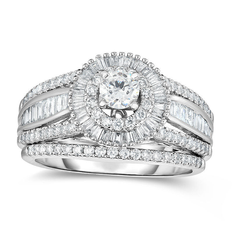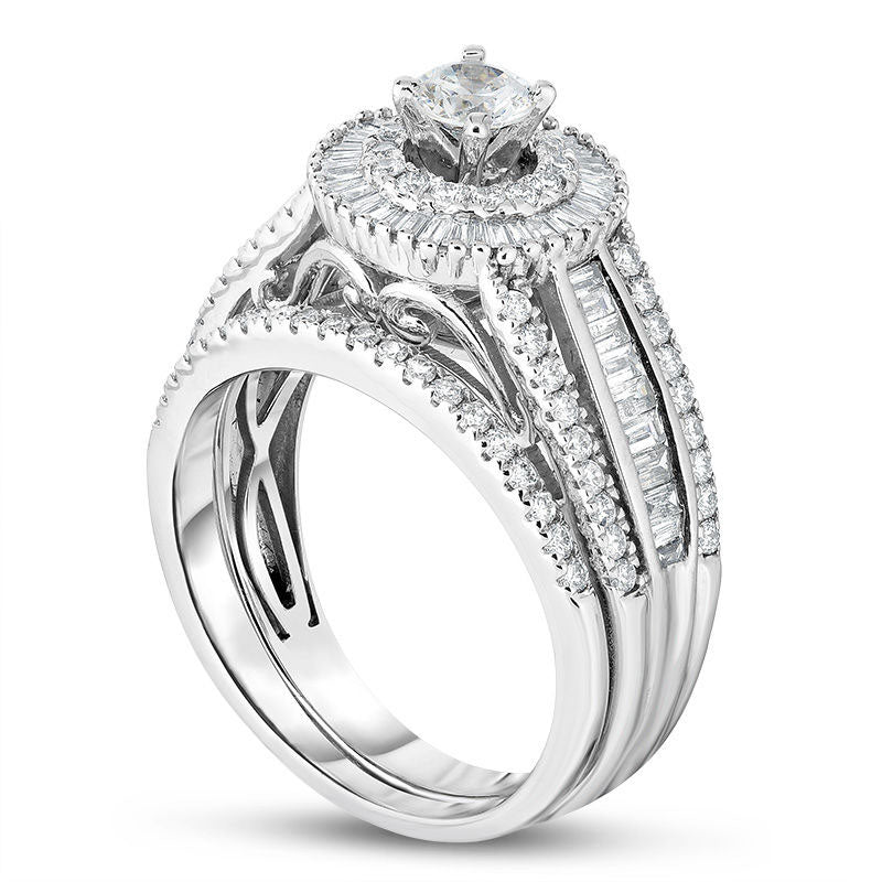 Looking for the perfect way to say "I do?" Look no further than this stunning diamond bridal set. Made with 14K white gold, the engagement ring features a gorgeous 1/3 ct. diamond in the center, surrounded by a double halo frame of round diamonds and baguette-cuts that create a stunning starburst effect. The multi-row split shank is adorned with even more baguette and round diamonds that curve gracefully around your finger. On your big day, seal your vows with the coordinating diamond wedding band. With a total of 1-1/4 cts. t.w. of diamonds and a brilliant polished shine, this bridal set is a breathtaking start to your forever together.