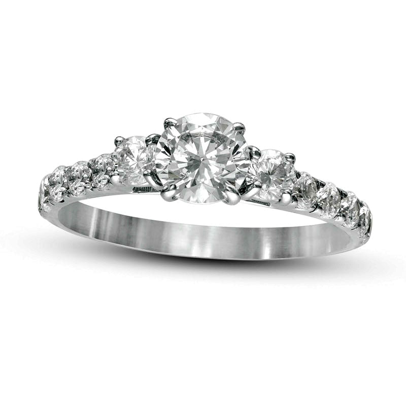 Surprise your beloved with the everlasting beauty of this exquisite diamond engagement ring. Crafted in lustrous 14K white gold, it boasts three resplendent diamonds, including a central 5/8 ct. diamond gleaming between two perfectly matched 1/8 ct. diamonds. The sparkling shank is encrusted with 1/20 ct. diamonds, enhancing the brilliance of the three stone design. Fashioned with a total diamond weight of 1-1/4 cts. and a radiant buffed finish, this engagement ring will leave her enthralled.
