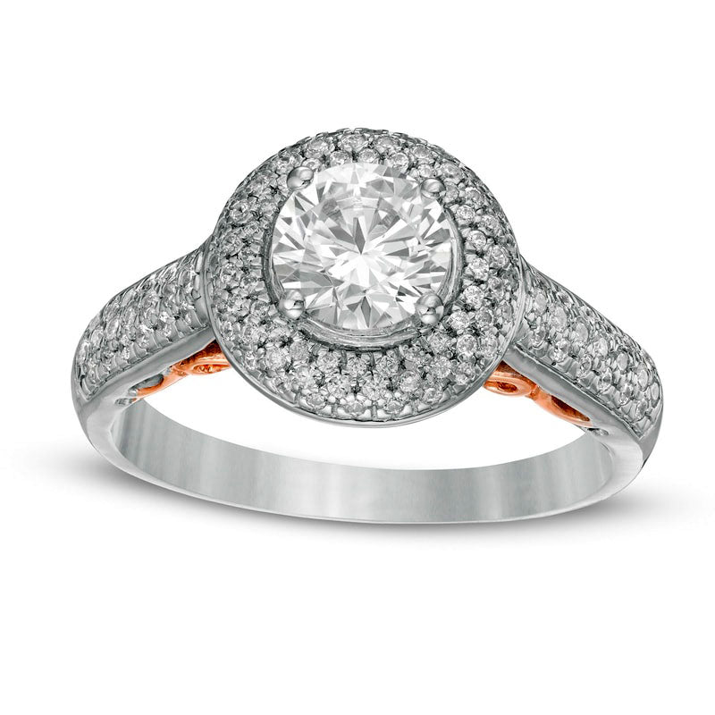 Introducing the ideal addition to elevate her glamorous appeal - the 1-1/3 CT. T.W. Diamond Frame Multi-Row Engagement Ring in 10K Two-Tone Gold. This stunning piece features a brilliant 3/4 ct. diamond encased in a halo of diamonds, set in 10K two-toned gold. The shank is crafted with three rows of diamonds in white gold, while the gallery showcases a beautifully sculpted floral design that glimmers in rose gold. With a total weight of 1-1/3 cts. t.w. of diamonds, this engagement ring is sure to captivate the hearts of many. The bright polished finish adds a touch of sophisticated elegance to this breathtaking piece. Don't miss out on this show-stopping engagement ring that is certain to leave a lasting impression.