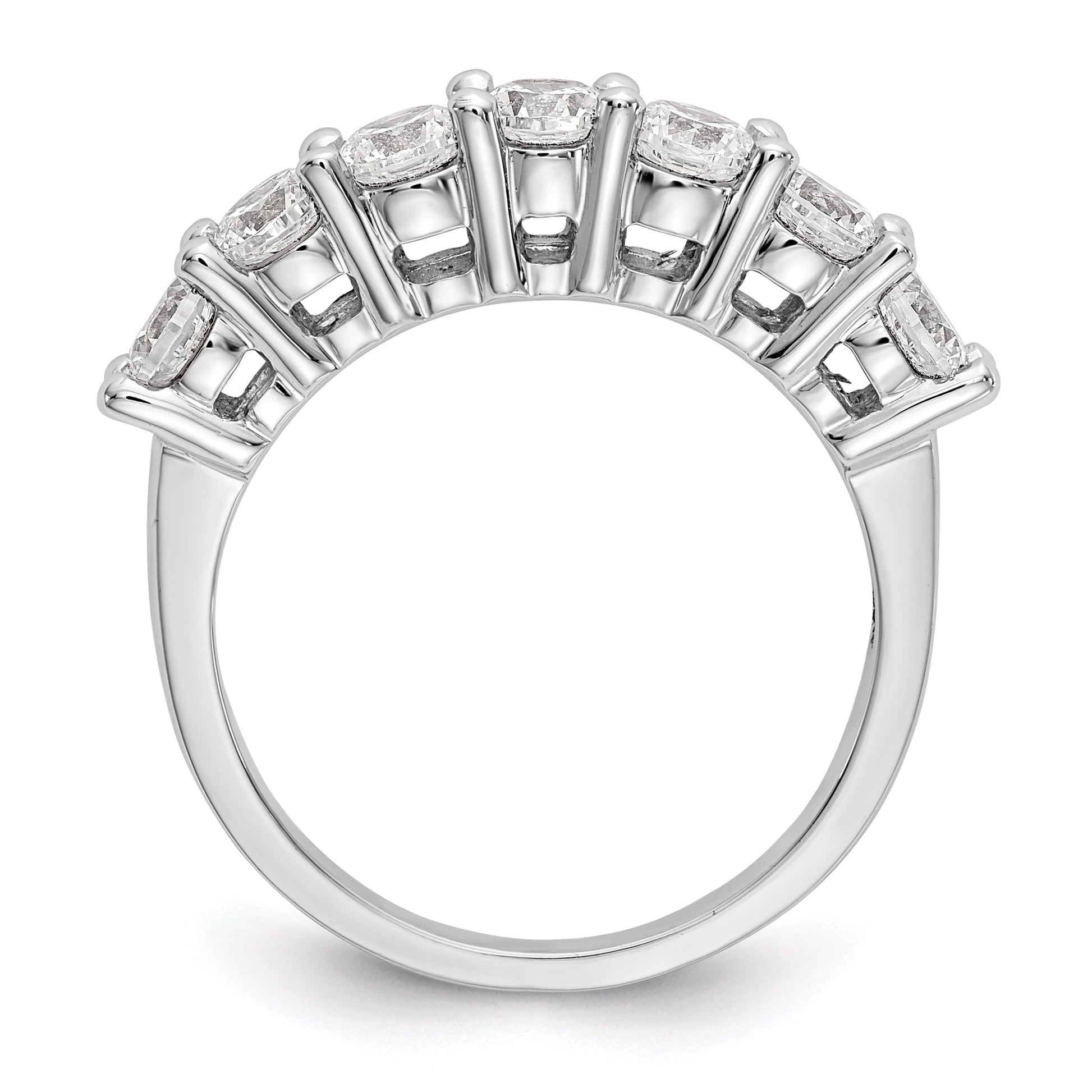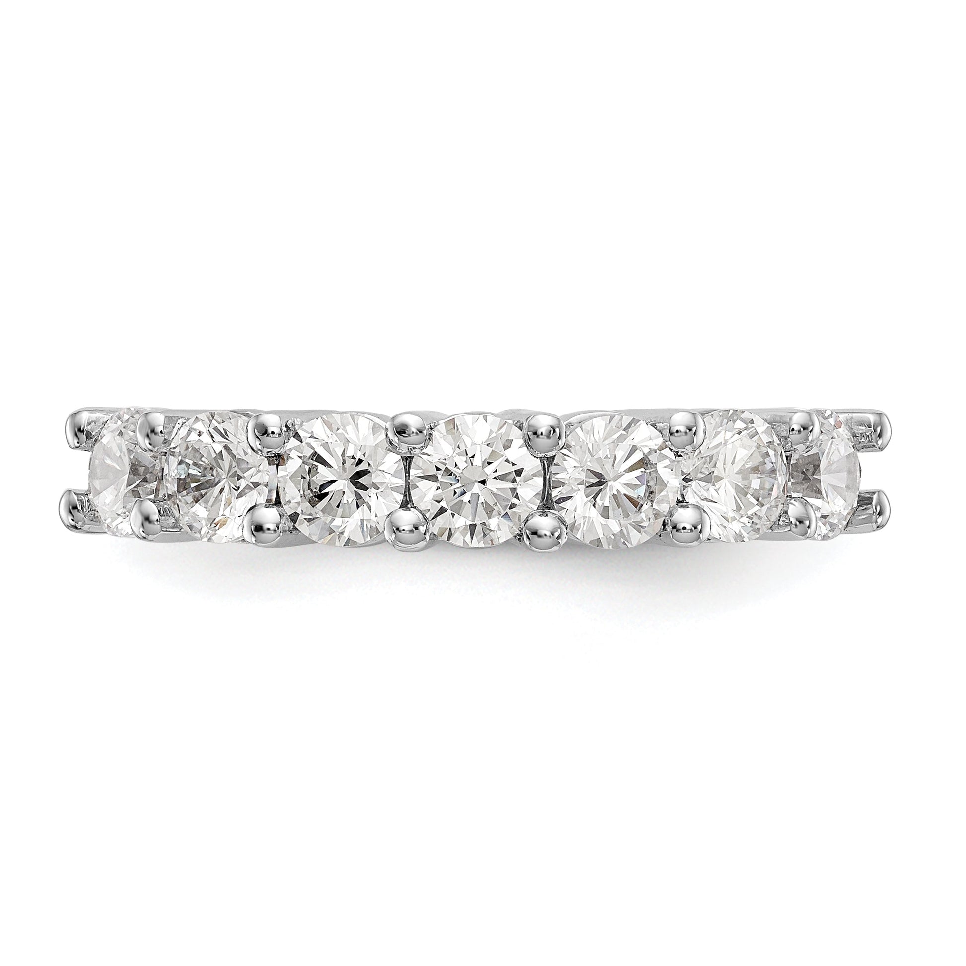 This ring features a polished finish, seven side stone mountings, and has a band width of 3.8 to 1.9 mm (tapered). It is a solid, casted piece of jewelry without any stones included. It is sizeable and the stone shape is round with a size of 3.7mm and weight of ct. The ring has a thickness of less than 1.5mm and is not engravable. The product type is a jewelry mounting and it is sold by unit. The primary color of the ring is white and it is classified as a wedding band with a closed back feature.