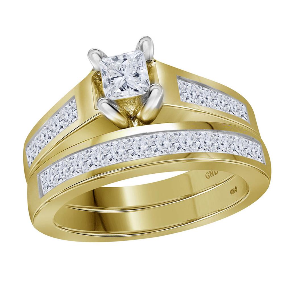 Introducing the stunning '1 5/8CT Diamond 3/8CT CPR Bridal Set', crafted with luxurious 14kt yellow gold and weighing approximately 11.53 grams. The total carat weight of the exquisite set is 1 and 5/8, featuring round-shaped gems in a 4-prong setting with a primary gem carat weight of 1.65. This bridal set does not include any secondary gems, but is sure to make a statement on your special day.