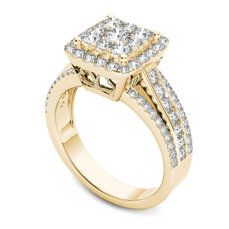 This engagement ring is the perfect way to show your love and commitment. It's made of 14K gold and features a cushion-shaped cluster of sparkling diamonds at the center, surrounded by a frame of smaller diamonds. The ring's band is also lined with diamonds, adding extra elegance and shine. In total, the ring contains 1.5 carats of diamonds, making it a truly stunning piece of jewelry. It's sure to capture your heart and the heart of your loved one.