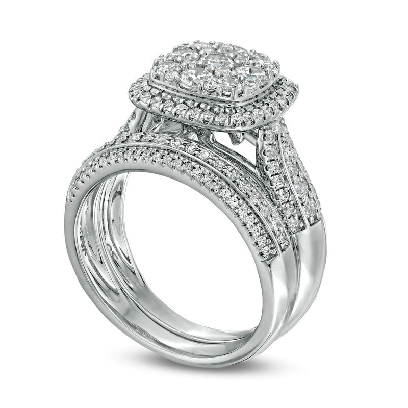 This stunning diamond bridal set is perfect for capturing all the beautiful moments of your life. Made from 10K white gold, the engagement ring boasts an impressive cushion-shaped composite diamond in a halo, with a triple-row shank adorned with diamonds. The matching wedding band complements the set, featuring three rows of diamonds. With 1-1/2 cts. t.w. of diamonds and a dazzling shine, this bridal set is sure to make your loved one feel special.