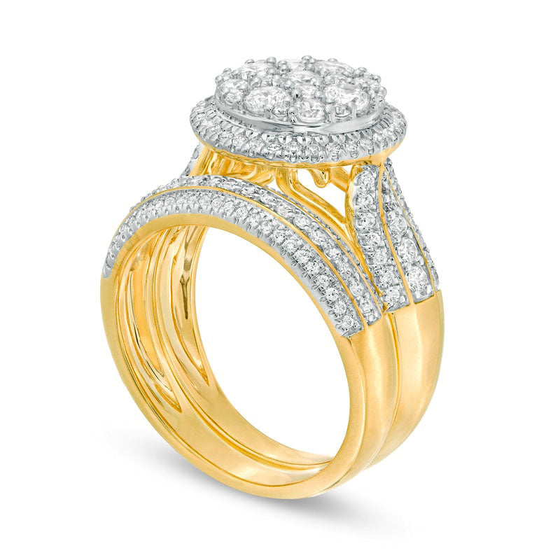 1.5 CT. T.W. Composite Natural Diamond Frame Multi-Row Bridal Engagement Ring Set in Solid 10K Yellow Gold
