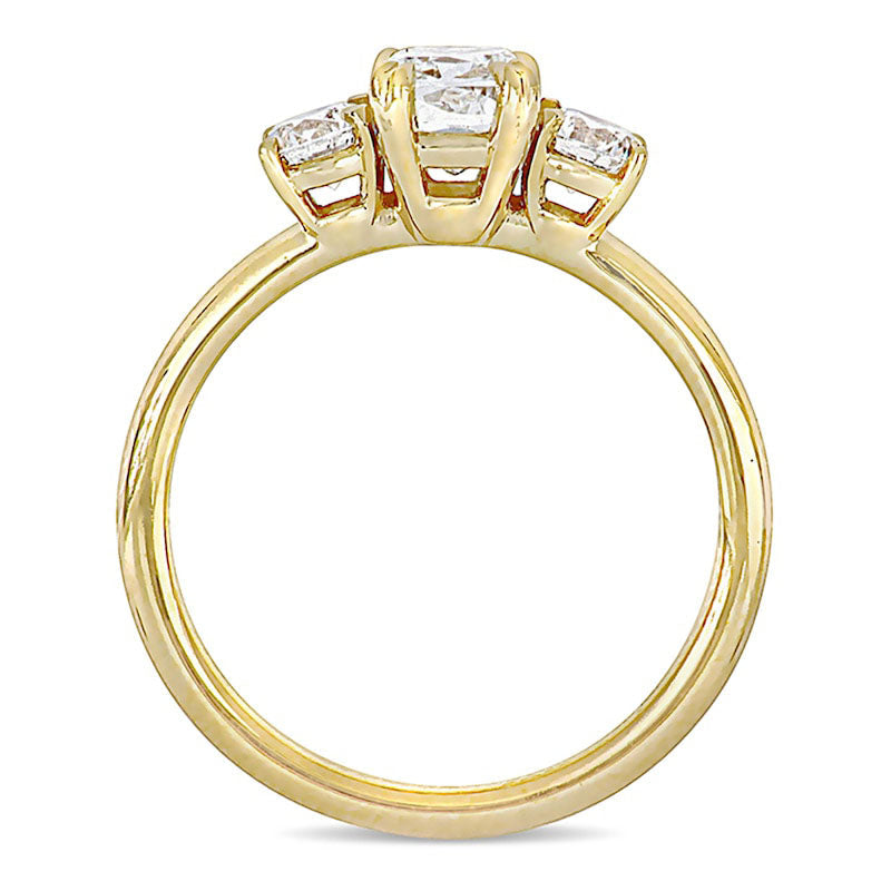 Looking for an exquisite engagement ring to start your journey of love? Look no further with this stunning 1-1/2 CT. T.W. Cushion-Cut Diamond Three Stone Ring in 14K Gold. This timeless piece features a sparkling 1 ct. cushion-cut diamond center stone flanked by two 1/4 ct. round diamonds, all set in a sleek gold band. With 1-1/2 cts. t.w. of diamonds and a brilliant buffed luster, this three-stone engagement ring is nothing short of breathtaking - the perfect symbol of your everlasting love.