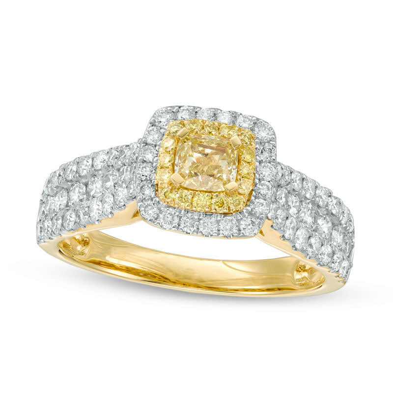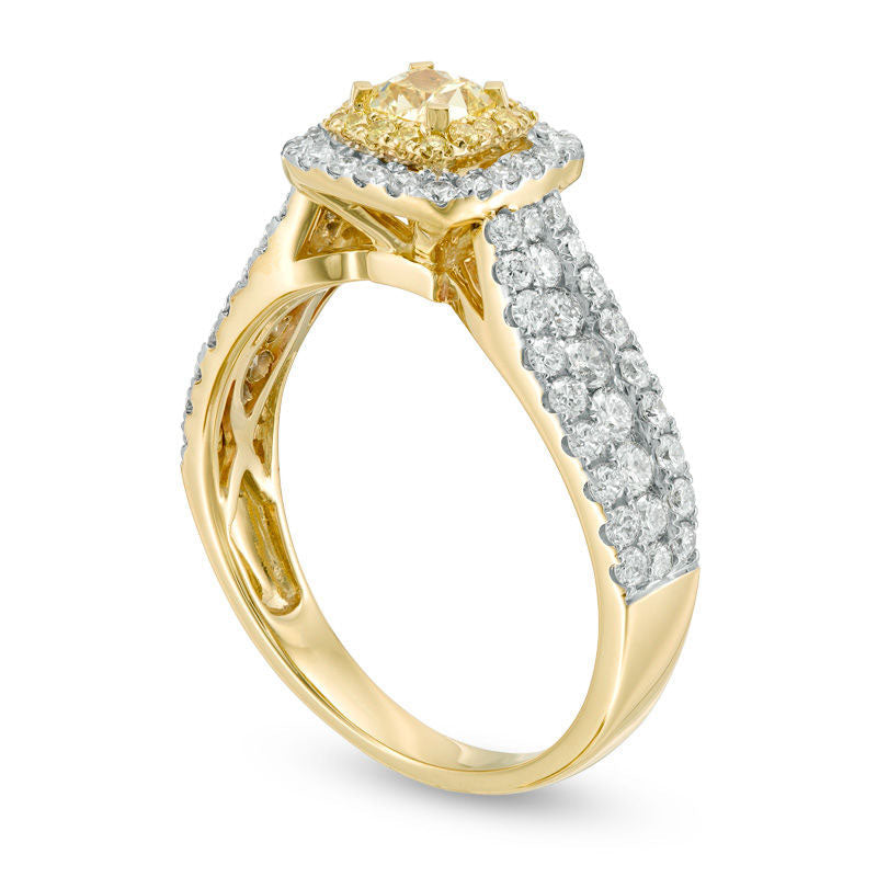 1.5 CT. T.W. Cushion-Cut Yellow and White Natural Diamond Double Frame Multi-Row Engagement Ring in Solid 14K Gold - Size 7