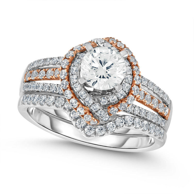 Presenting a truly entrancing and enchanting diamond bridal set that aptly symbolizes your love and devotion. Made with the finest quality 14K two-toned gold, the engagement ring boasts a 3/4 ct. diamond that is adorned with a marquise-shaped frame featuring two distinct hues - white gold and rose gold - both of which are encrusted with dazzling diamonds. The shank is split and decorated with ribbons of white gold and diamonds, with a center row of rose gold and diamonds. The wedding band that comes with this phenomenal set has been carefully contoured and lined with diamonds to perfectly complement the engagement ring, creating a stunningly dramatic effect. This magnificent bridal set features 1-1/2 cts. t.w. of diamonds that sparkle and shine with a brilliant radiance, making it an absolute showstopper. Perfect for your special day, this bridal set is sure to take your breath away.