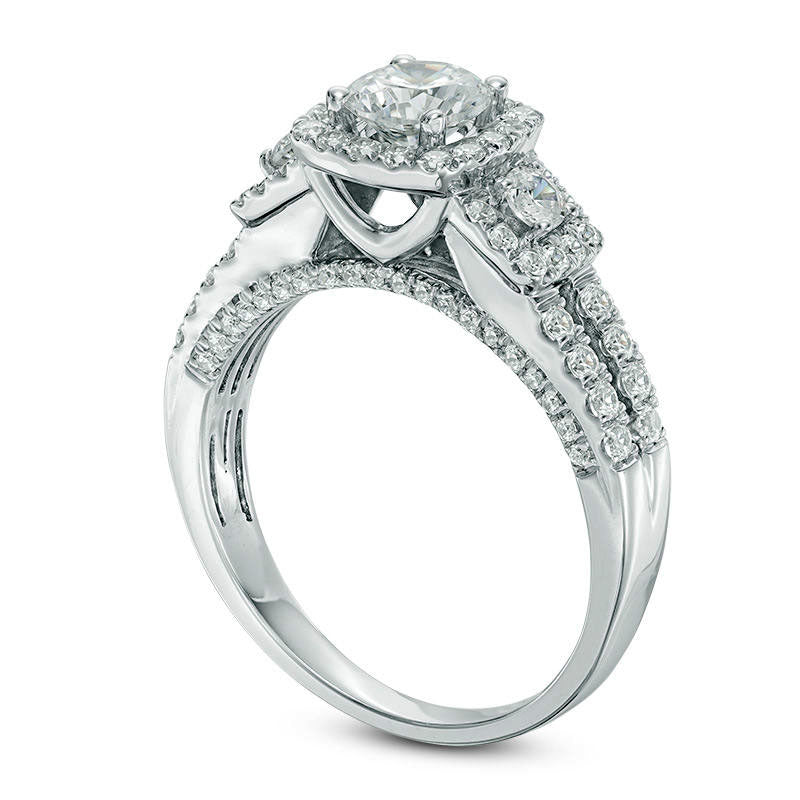 Impress your significant other with a breathtaking symbol of your love - this exquisite diamond engagement ring. Made from stunning 10K white gold, the ring showcases a trio of dazzling cushion-shaped diamond composites. The centerpiece features an impressive 5/8 ct. diamond, while the striking two-row split shank glitters with diamonds on three sides, guaranteeing sparkle from all viewpoints. With a total diamond weight of 1-1/2 cts. t.w. and a brilliant buffed luster, this three-stone engagement ring radiates pure sophistication and sets a stylish tone. Show your devotion and make a bold statement with this dramatic piece.