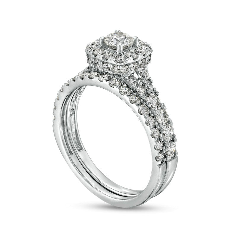 This is a beautiful diamond bridal set made out of 10K white gold. The engagement ring has a 1/3 carat diamond in the center, surrounded by more diamonds in a cushion shape. The band splits into two parts and has more diamonds of different sizes. The wedding band is curved and covered in diamonds. The set has a total of 1.5 carats of diamonds and a shiny finish. It is perfect for a memorable engagement and wedding day.