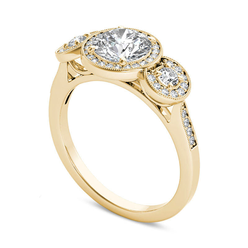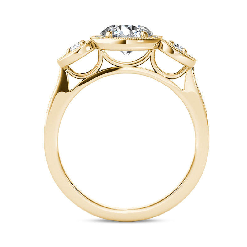 Impress your beloved with the stunning vintage-inspired diamond engagement ring featuring an elegant three-stone design. This exquisite piece is expertly crafted in lustrous 14K gold and showcases a luminous 1 ct. diamond at the center embellished with a diamond-encrusted frame. Moreover, the two smaller round diamonds, also surrounded by diamond frames, enhance the ring's allure. The elegant shank of the ring is adorned with diamonds and detailed with milgrain work, giving it a charming antique feel. Flaunting a total diamond weight of 1-1/2 cts. t.w. and a radiant luster, this engagement ring is a perfect symbol of your commitment and affection.