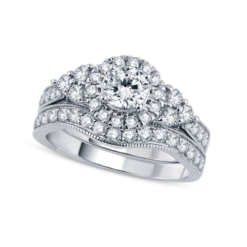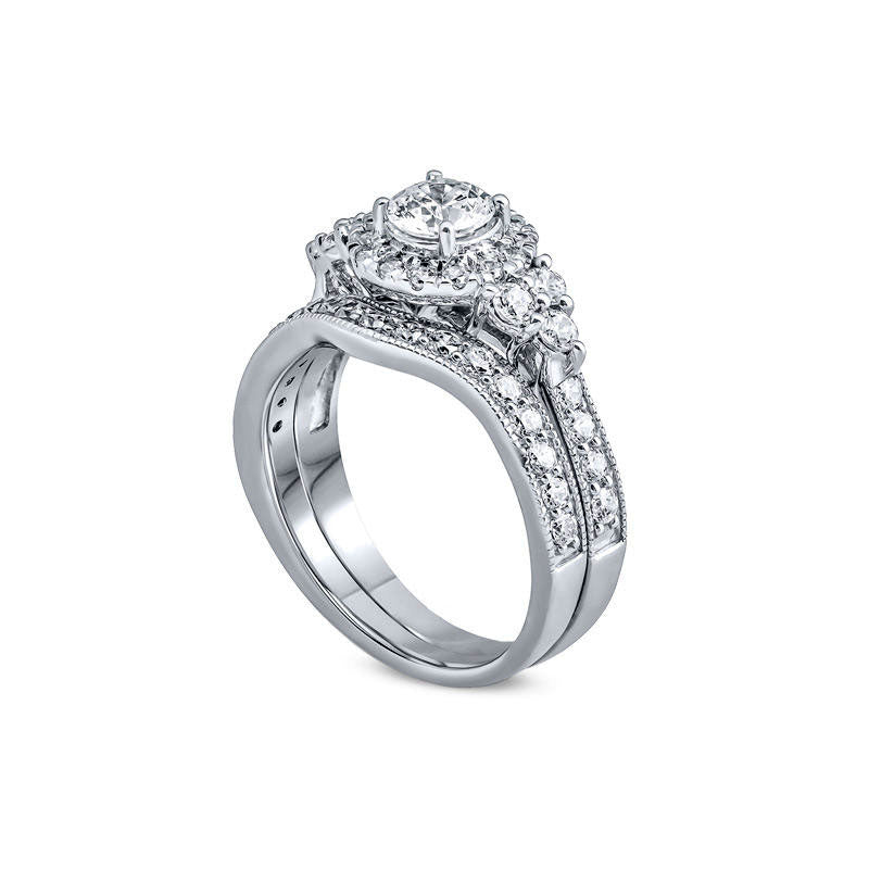 This stunning diamond bridal set is sure to be adored and passed down as a cherished family heirloom. Crafted in elegant 14K white gold, the engagement ring boasts a sparkling 1/2 ct. diamond surrounded by a diamond-lined frame. Trios of diamonds grace the sides, while additional diamonds adorn the pinched shank with a charming milgrain-edged design. Completing the vintage-inspired look is a contoured diamond and milgrain band, perfectly coordinating with the engagement ring. With a total weight of 1-1/2 cts. of diamonds and a brilliant shine, this exceptional bridal set will be treasured for years to come.