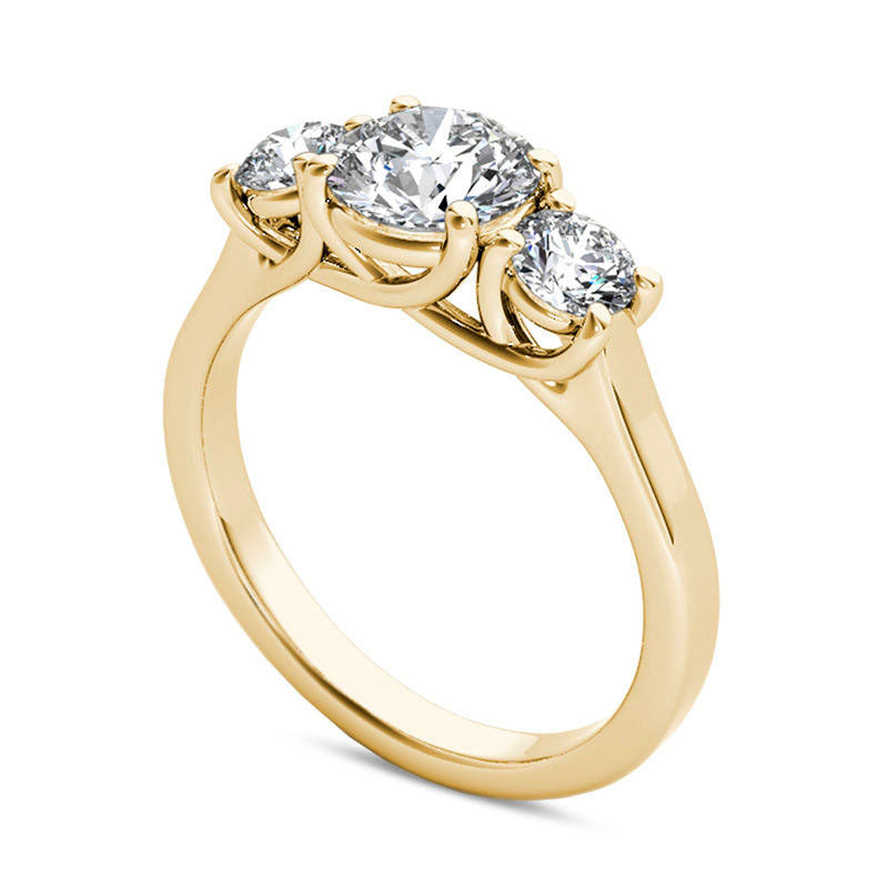 Express your love in the most splendid way possible with this stunning three-stone diamond engagement ring. Meticulously crafted in premium 14K gold, the elegant cross-prong design presents a gorgeous 1...