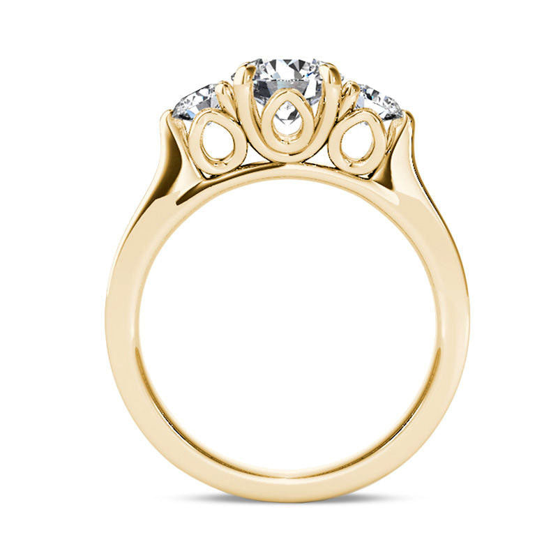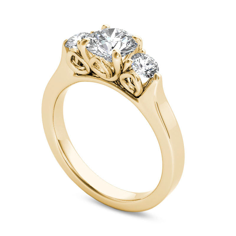 Make her dream come true with a truly unforgettable moment with this stunning diamond engagement ring. Skillfully crafted from radiant 14K gold, this three-stone design boasts a dazzling 1 ct. center diamond with two 1/4 ct. diamonds on each side. Its dramatic style is showcased by a wide boxed shank and elegant looping setting details. Mesmerizing with a total of 1-1/2 cts. t.w. of diamonds and a brilliant buffed luster, this engagement ring beautifully represents your unique love story.