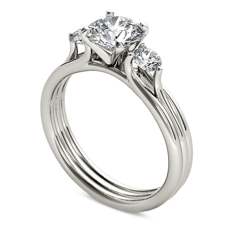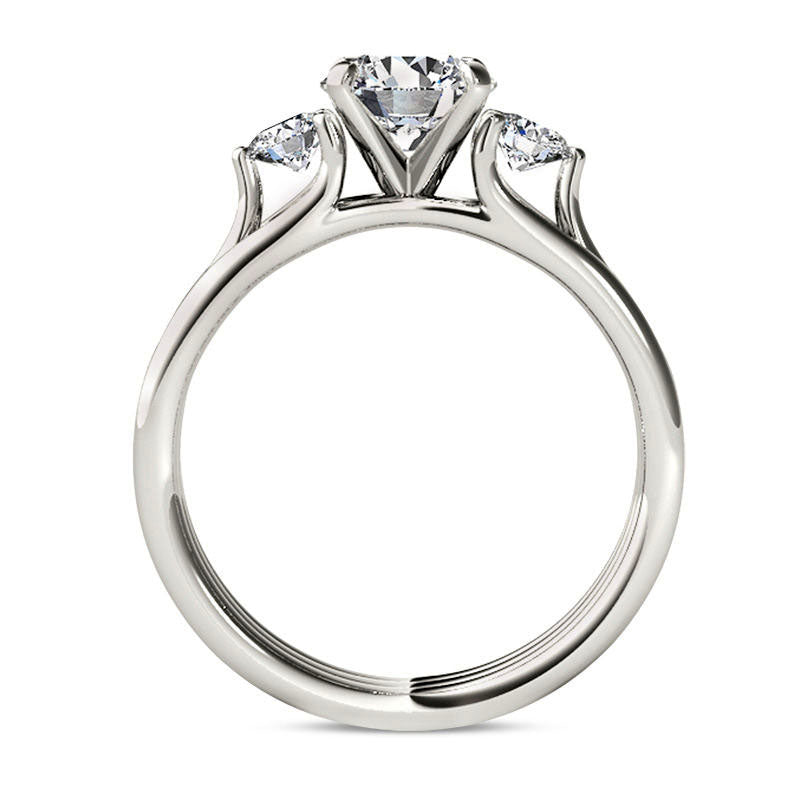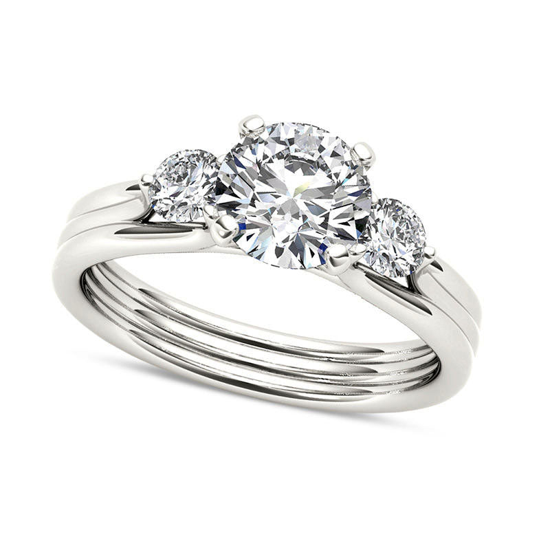 Shop our breathtaking 1-1/2 CT. T.W. Diamond Three Stone Engagement Ring in beautiful 14K White Gold. This engagement ring is the perfect way to express your love and commitment. The stunning three-stone design features a shimmering 1 ct. diamond center stone accompanied by smaller diamonds that are set in a unique and feminine way. The shank of the ring is sculpted with grooves that add to its captivating look. With a total weight of 1-1/2 cts. t.w. of diamonds and a bright polished shine, this engagement ring is sure to take her breath away. Order yours today and start your forever journey together in style!
