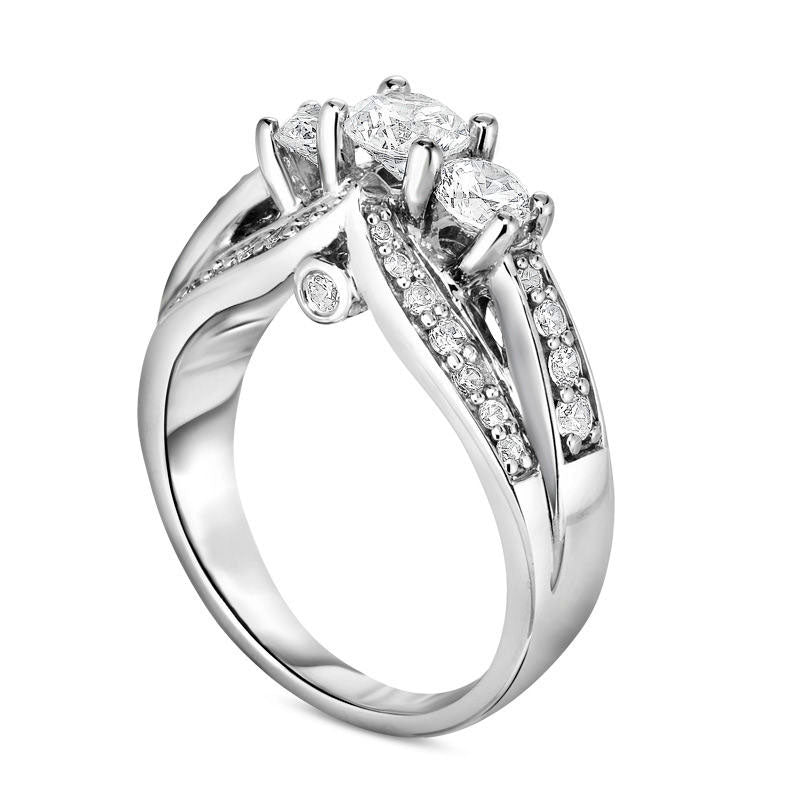 This exquisite diamond engagement ring is sure to leave her spellbound with its stunning design. Made of 14K white gold, this alluring ring flaunts a trio of diamonds at the center, with the largest one being half a carat. The split shank of the ring is adorned with rows of dazzling diamonds, with two side rows coming together at a point. The inner apex of these two rows are set with single bezel diamonds that gleam in the light. The ring's total diamond weight is 1-1/2 carats, creating a truly breathtaking display. This engagement ring is the perfect choice for the modern and feminine bride-to-be, shining with a brilliant luster that is sure to make her heart skip a beat.