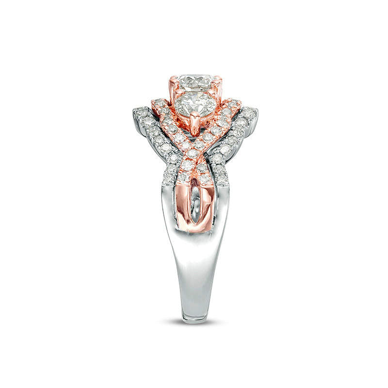 This stunning diamond engagement ring is sure to impress. Made from 10K two-tone gold, it features a captivating design with a 1/2 ct. diamond at the center, surrounded by rose gold and a twist scalloped diamond frame. The outer borders are lined with white gold and sparkling diamonds, creating a dramatic and eye-catching display. With a total weight of 1-1/2 cts. t.w. and a brilliant shine, this engagement ring is the perfect way to celebrate your love.
