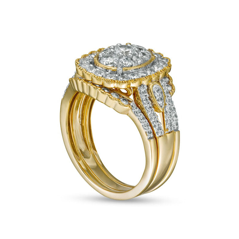 1.63 CT. T.W. Composite Natural Diamond Frame Scallop Edge Three Piece Bridal Engagement Ring Set in Solid 10K Yellow Gold