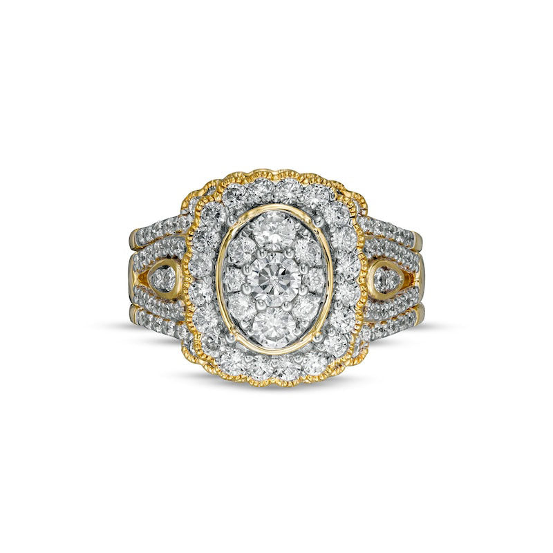 Experience love in its grandest form with this exquisite bridal set that perfectly matches your extravagant passion. Made from elegant 10K gold, the engagement ring features a captivating oval-shaped diamond composite that exudes radiance. The scallop-edged frame is adorned with dazzling round diamonds and delicate milgrain detailing that adds to its timeless beauty. Two teardrop-shaped diamonds take their place on either side of the center, while more diamonds line the split shank, making this ring truly remarkable. The delicately designed wedding bands complete the set, complementing the scalloped milgrain-bordered contour and the shank with sparkling diamonds. With a total weight of 1-5/8 cts. t.w., this bridal set represents your beautiful romance and is sure to leave you with a bright polished glow.