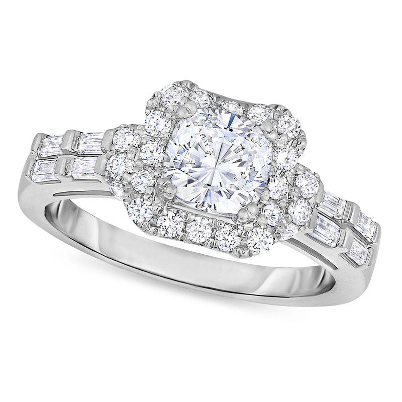 Make a lasting impression with this stunning cushion-cut diamond engagement ring. Fashioned from elegant 14K white gold, this exquisite ring showcases an impressive 1 ct. diamond center stone, artfully encased by a lavish frame of smaller round diamonds. The shank of the ring is adorned with round and channel-set baguette-cut diamonds, enhancing its sleek and modern appeal. With a total weight of 1-3/4 cts. t.w. in diamonds, this ring exudes elegance and sophistication, and is sure to take her breath away. With a luminous shine and impeccable craftsmanship, this engagement ring is a truly remarkable piece of jewelry.