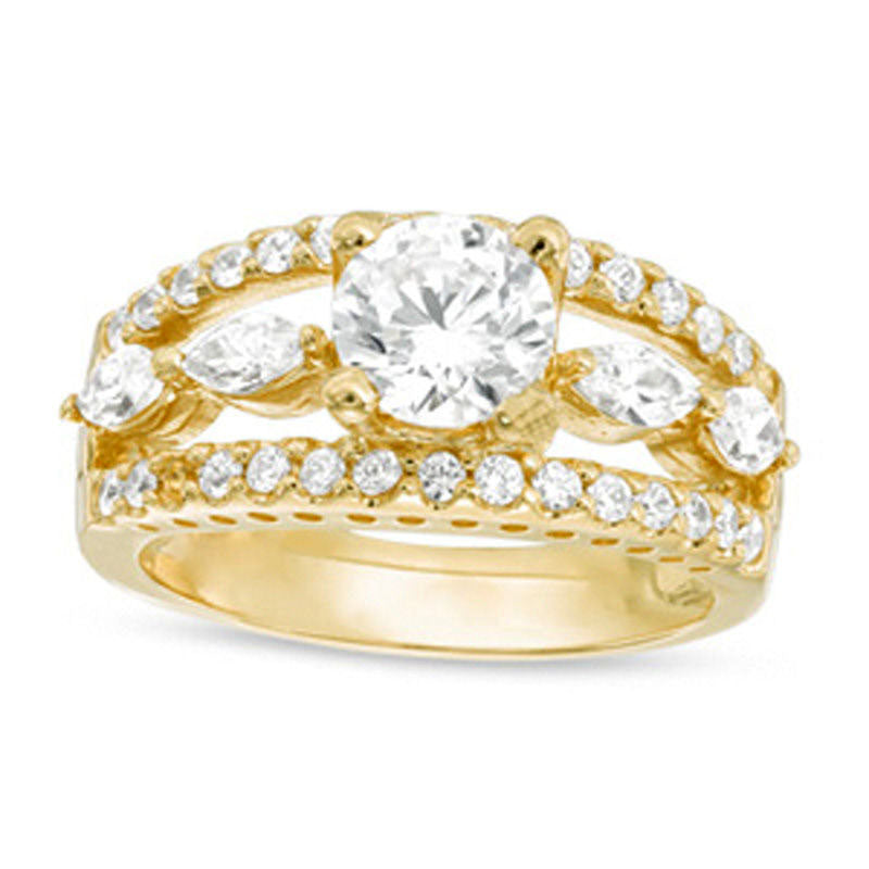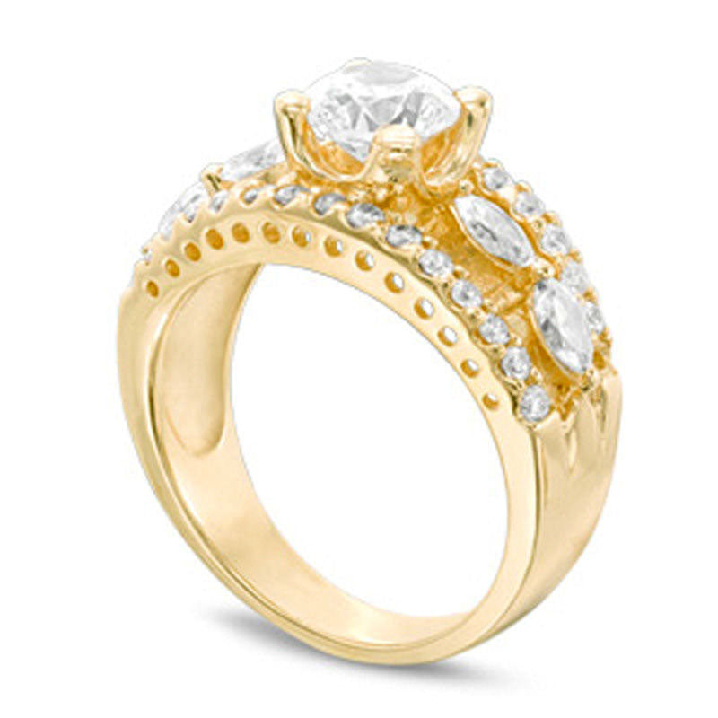 Celebrate your love with the stunning beauty of this exquisite diamond engagement ring. Crafted from luxurious 14K gold, this five-stone ring features a dazzling 1ct diamond center stone, accented by two expertly cut marquise diamonds on either side. The dazzling split shank is adorned with two outer rows of shimmering round diamonds, totaling 1-3/4 cts. t.w. This awe-inspiring piece is sure to become a treasured reminder of your love and devotion, gleaming with a brilliant luster that shines from every angle. Say "I do" in style with this magnificent engagement ring.