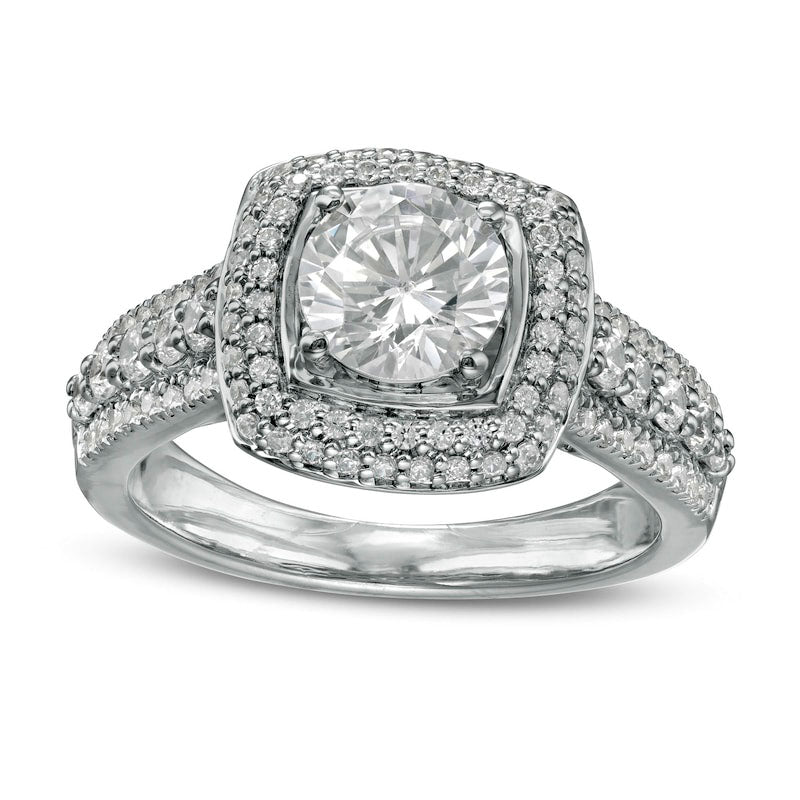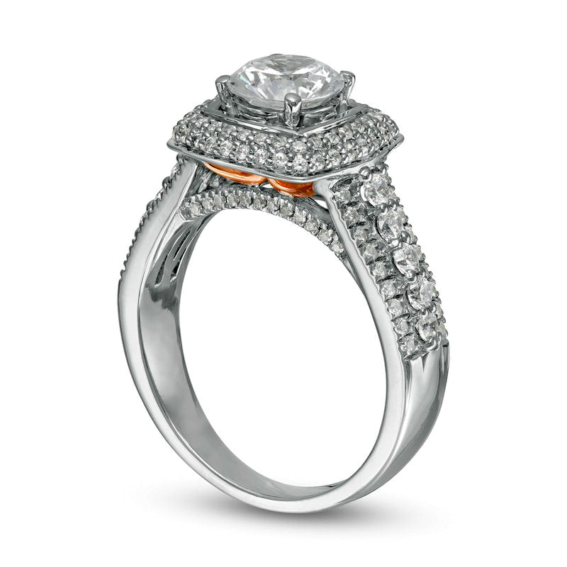 Indulge in opulence with this stunning diamond engagement ring. The exquisitely crafted piece boasts a 1 ct. round diamond encircled by a double cushion of diamonds, all set in 10K two-toned gold. The shank, made of white gold, is adorned with a center ribbon of graduated-size diamonds, flanked by petite diamonds on either side. Even the sculpted rose gold gallery is embellished with diamonds. With a total weight of 1-7/8 cts. t.w. and a high-polished gleam, this engagement ring is a true dream come true for any wearer.